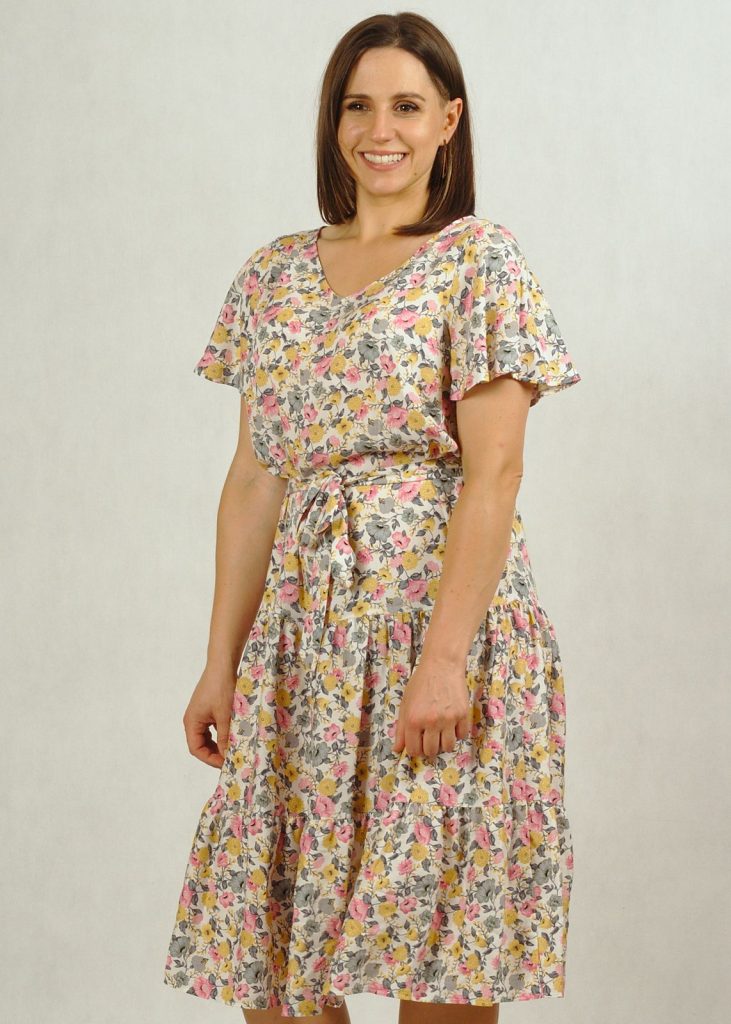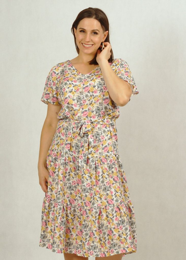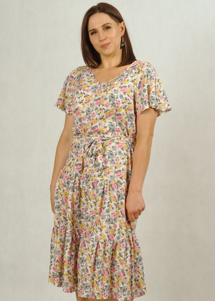 Kolor bazowy sukienki to ecru, a kwiatuszki mają kolor: różowy, zielony i żółty.*