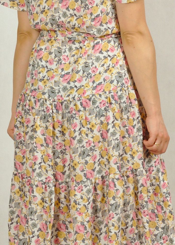 Sukienka ecru z falbanami i wiązaniem w pasie w drobne kwiatuszki premium /700/