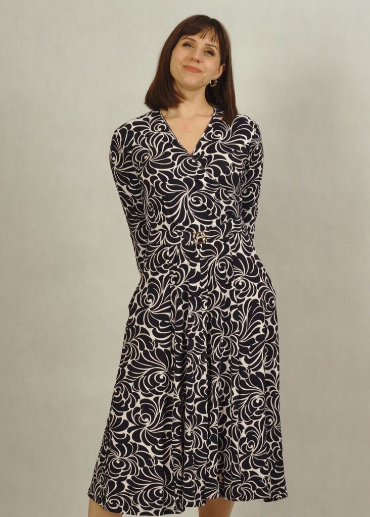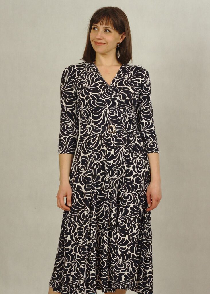 Sukienka granatowa w białe wzory to elegancka propozycja dla kobiet, które cenią połączenie klasyki i wygody.Ta sukienka midi zachwyca nie tylko swoją długością, ale także praktycznymi detalami – została wyposażona w funkcjonalne kieszenie. Sukienka z kopertowym dekoltem subtelnie podkreśla biust i talię, dodając sylwetce lekkości i kobiecego uroku.