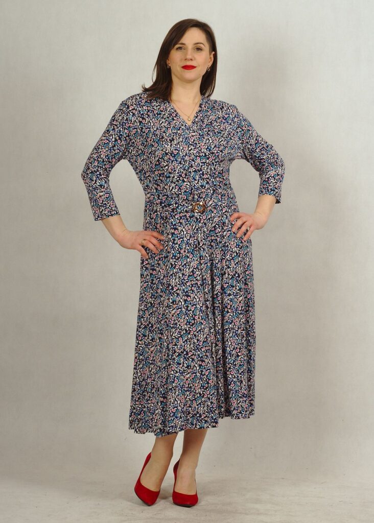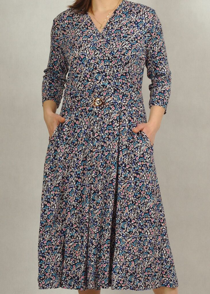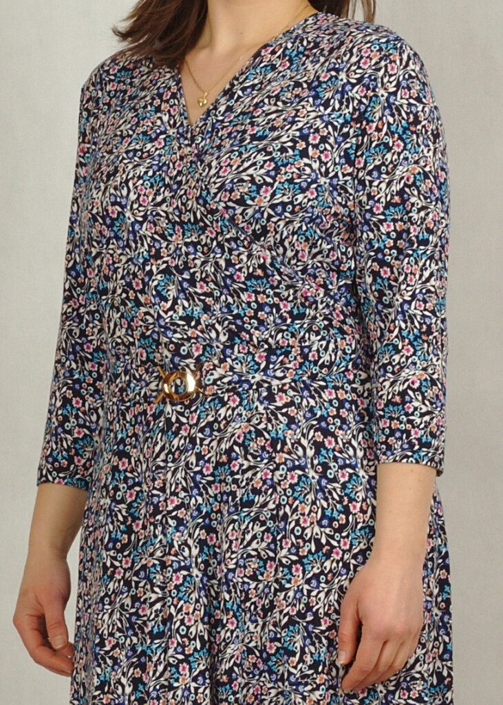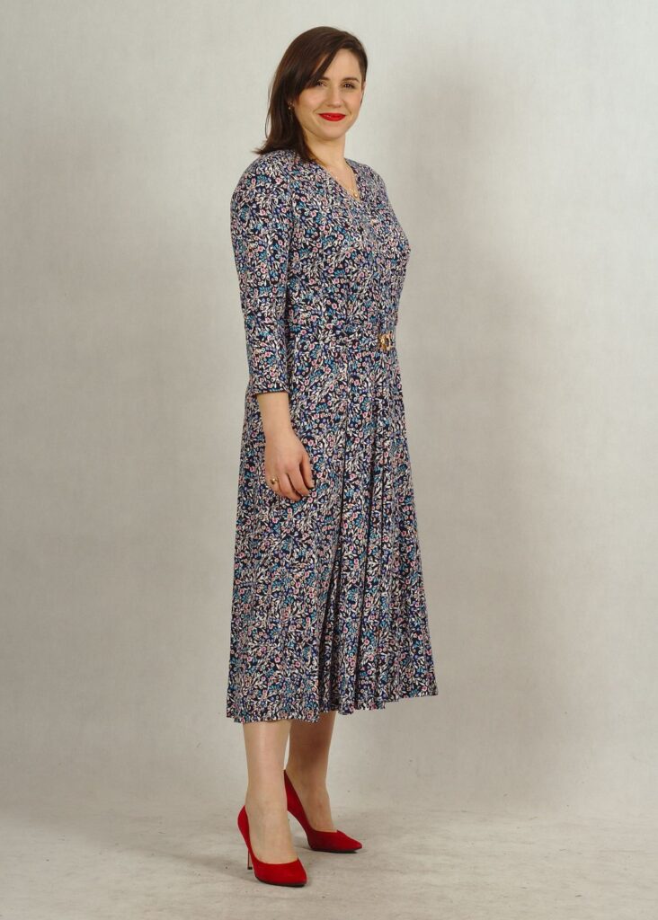 Sukienka z kopertowym dekoltem subtelnie podkreśla biust i talię, dodając sylwetce lekkości i kobiecego uroku.