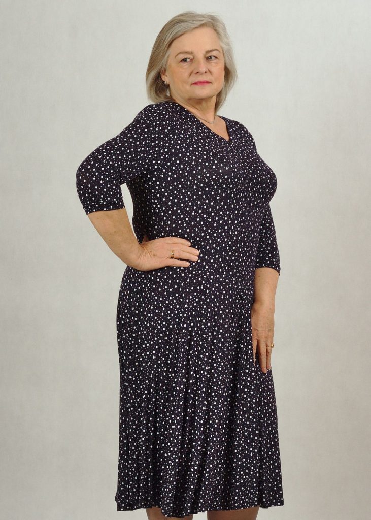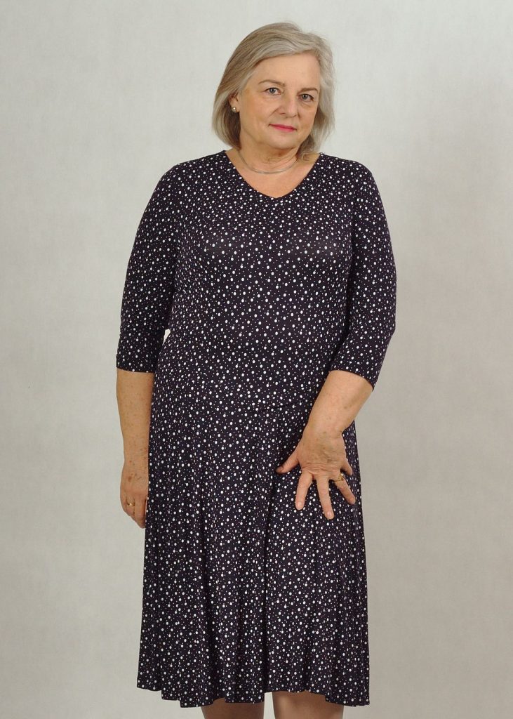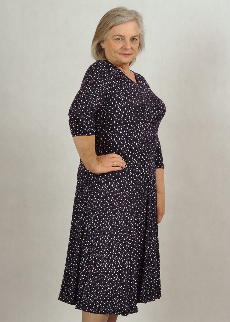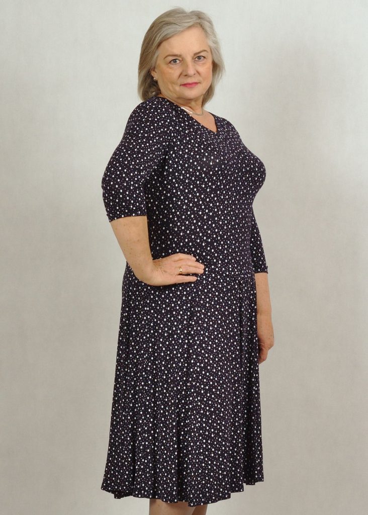 Dół sukienki lekko poszerzany, wyprofilowany cięciami.