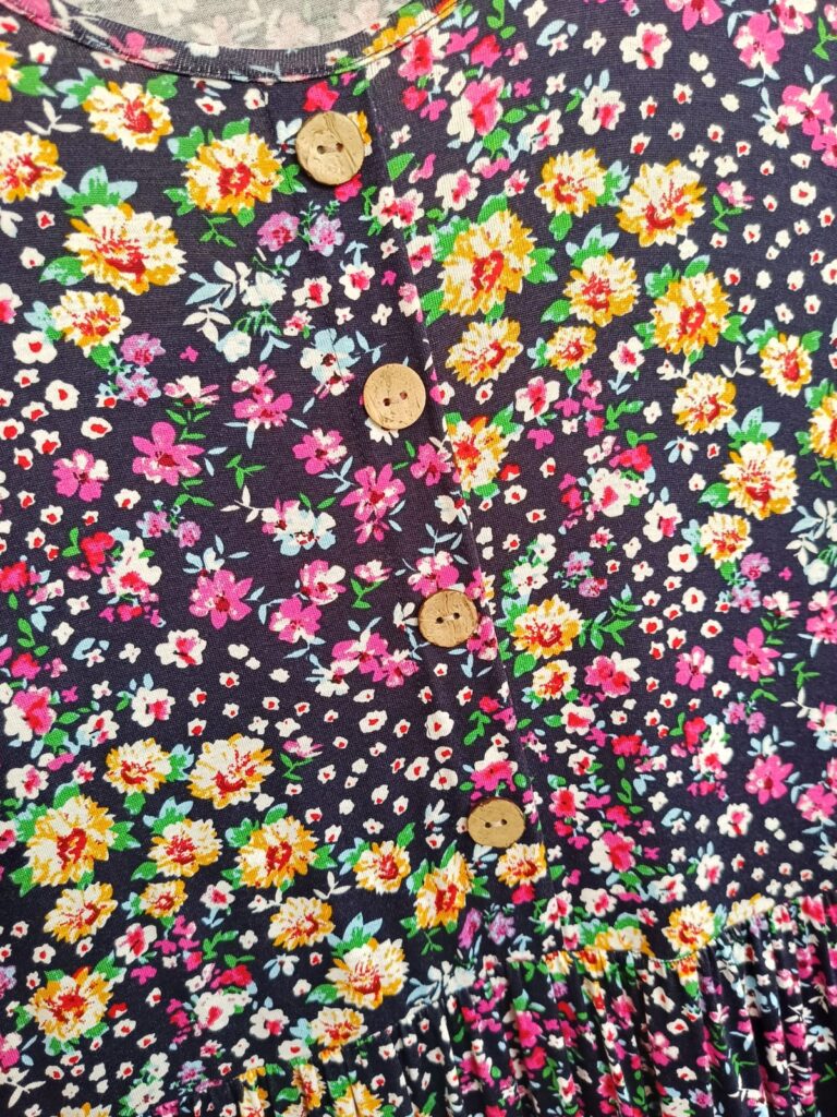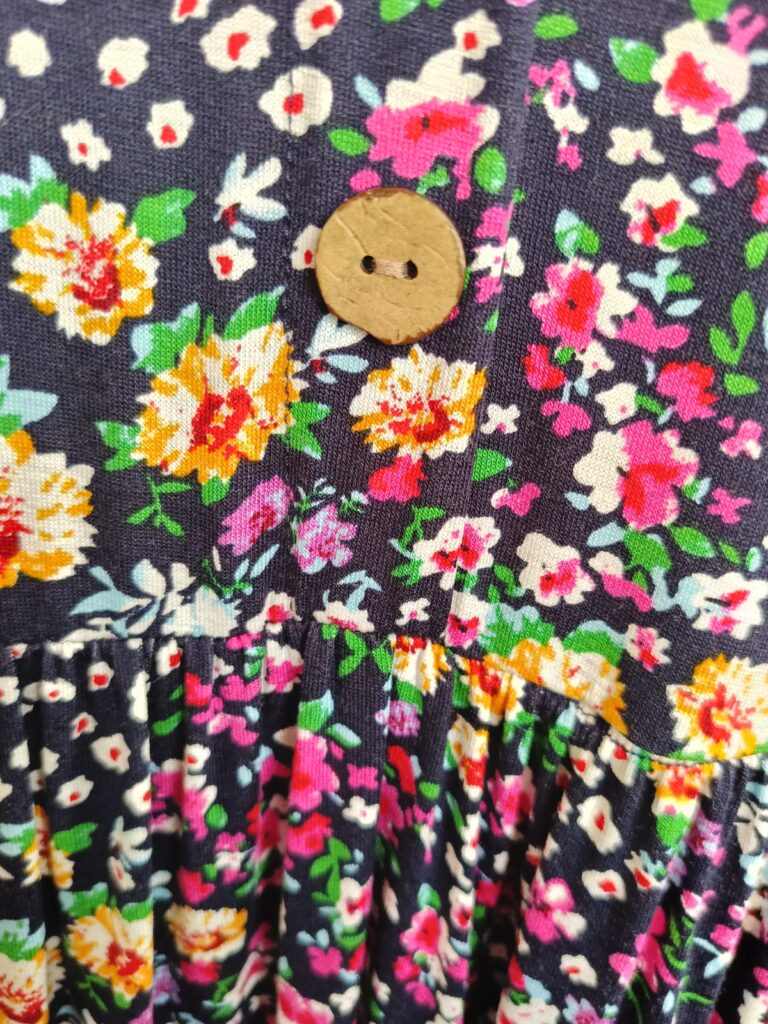 Sukienkę delikatnie zdobią kokosowe guziki.
