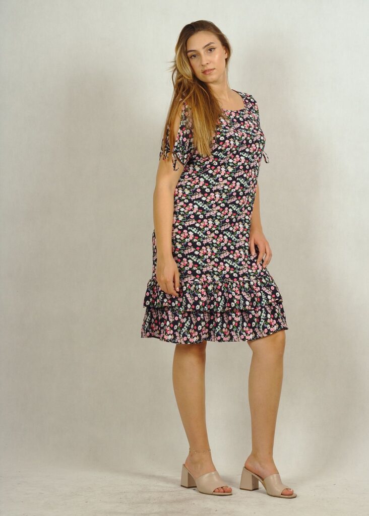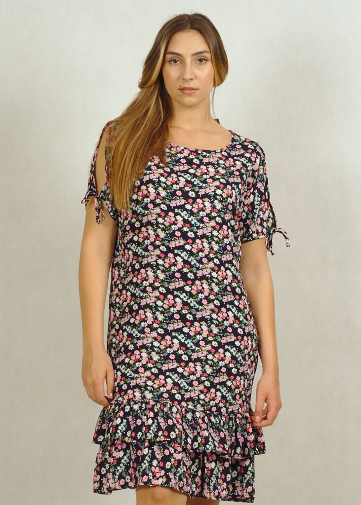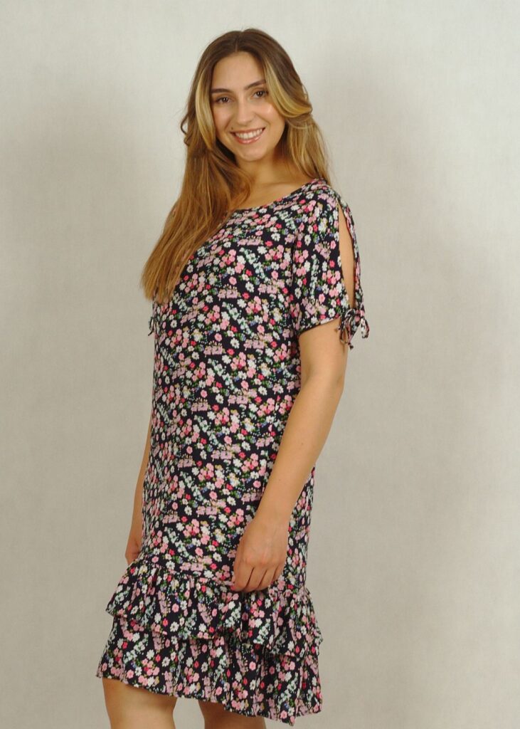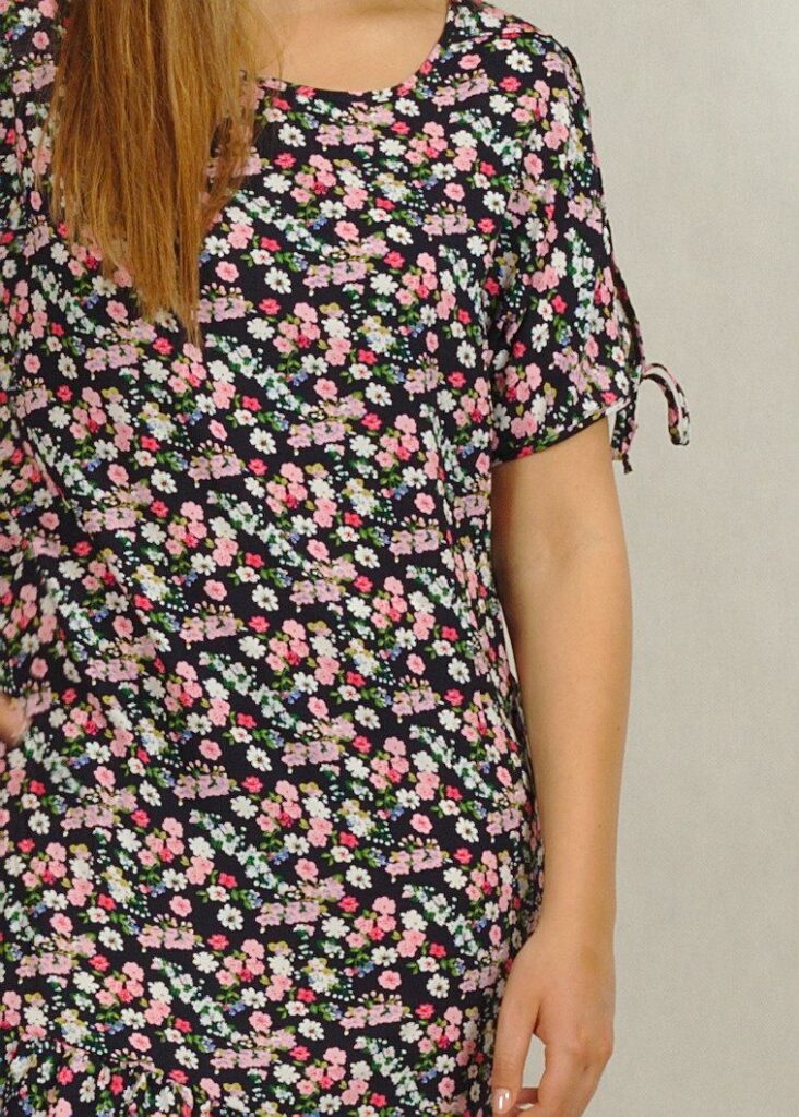 Sukienka granatowa w kwiatki różowe z falbanką i wiązaniem na ramieniu /626/