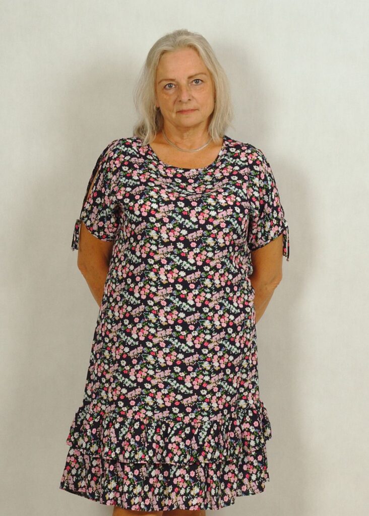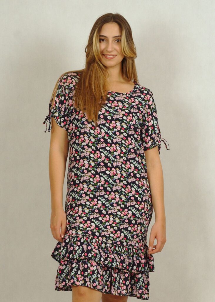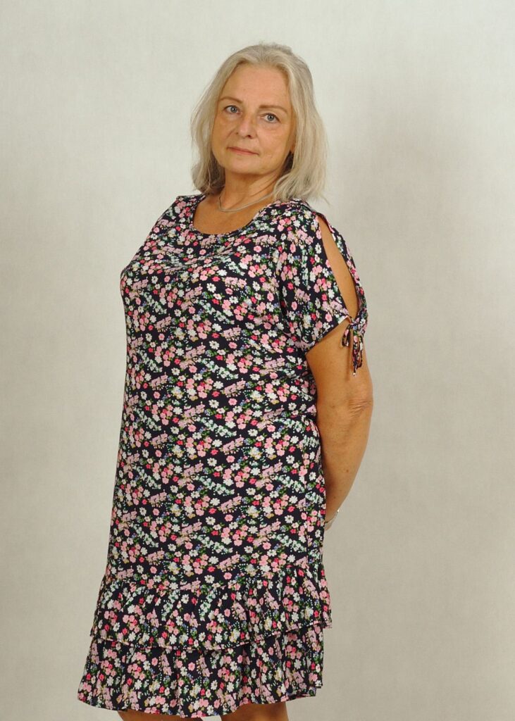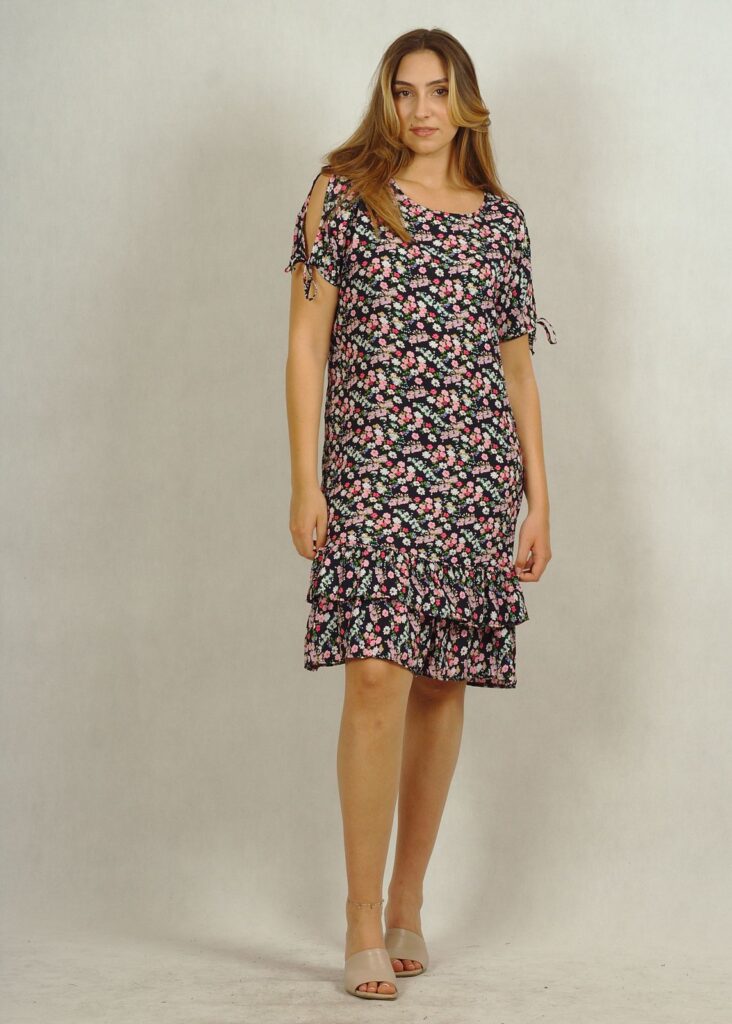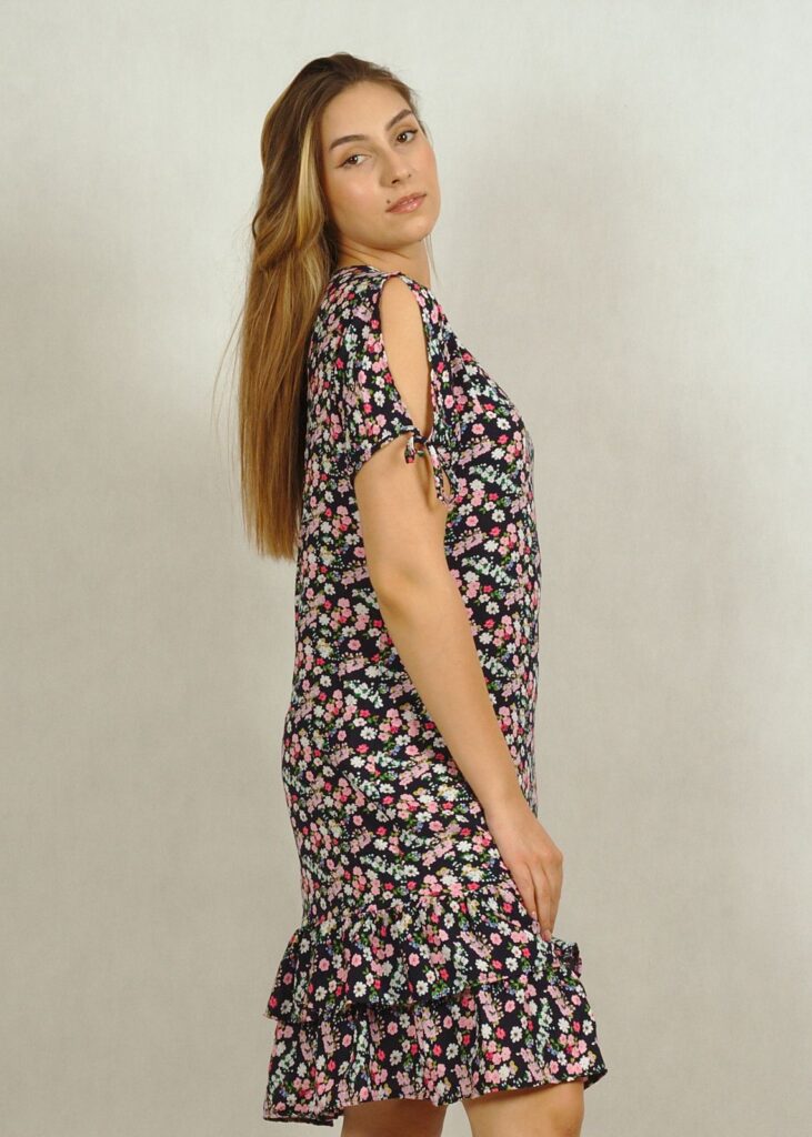 Sukienka granatowa w kwiatki różowe z falbanką i wiązaniem na ramieniu /626/
