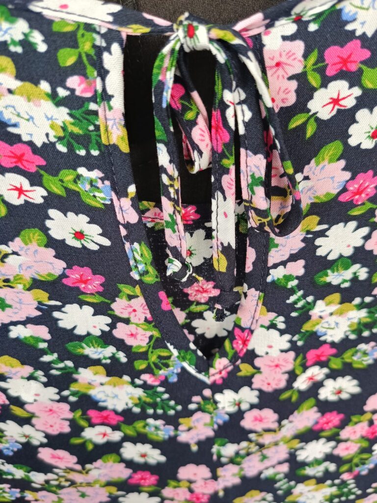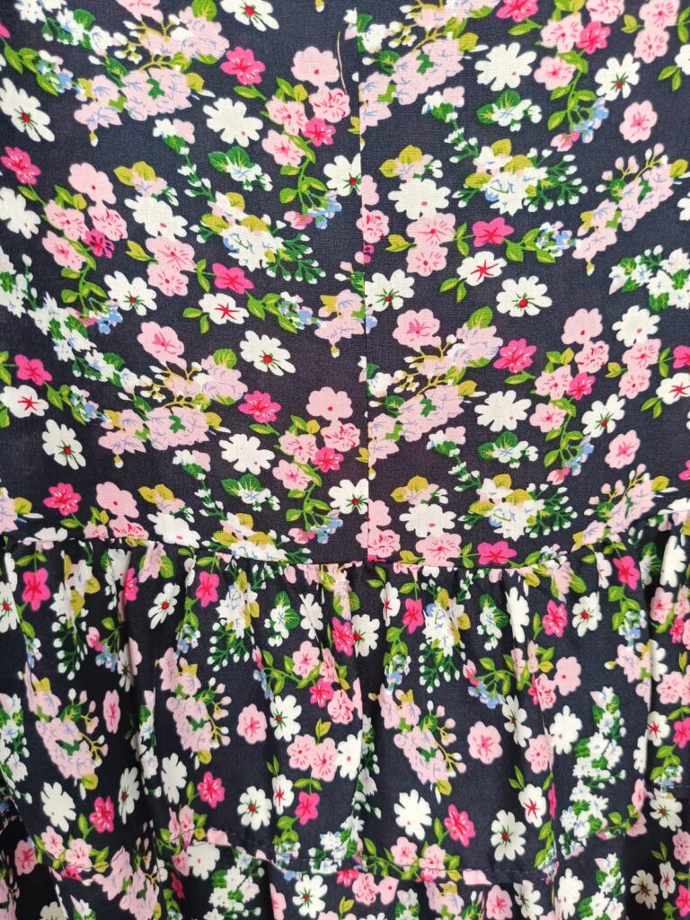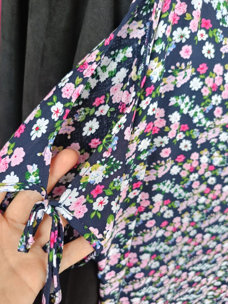 Sukienka ma prosty fason i posiada delikatne rozcięcia i wiązania przy rękawach. Sukienka ma śliczny kolor – granat z delikatnymi różowymi kwiatkami.