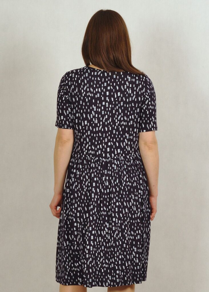 Sukienka jest granatowa w białe małe prostokąciki*.