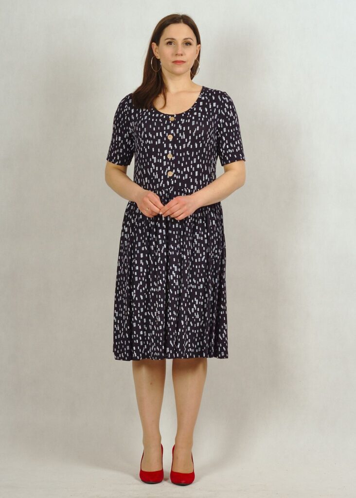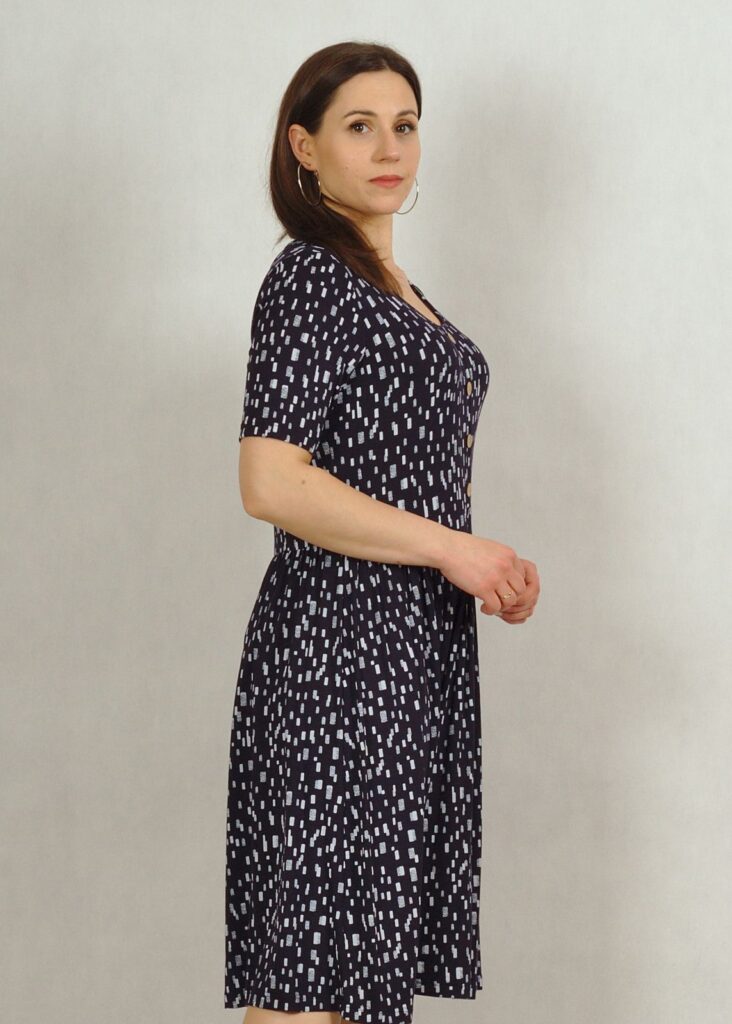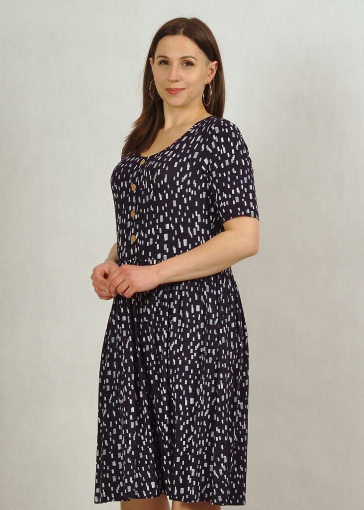 Niezwykle wygodna sukienka dzianinowa na krótki rękaw. Posiada półokrągły dekolt ozdobiony czterema “kokosowymi” guziczkami.