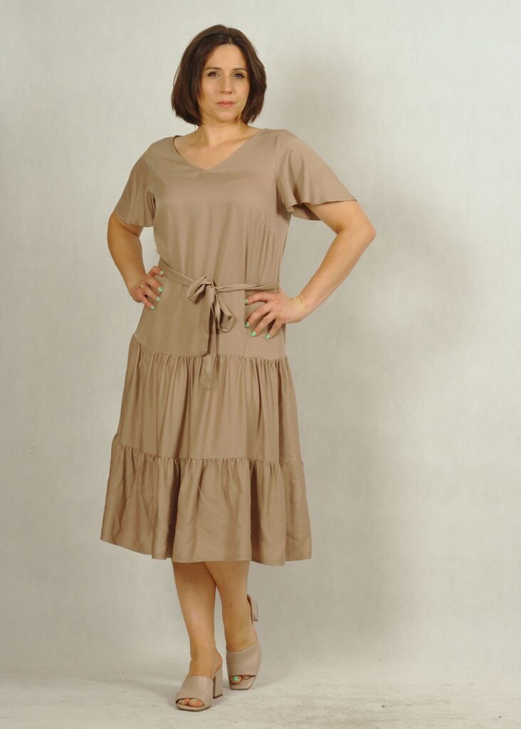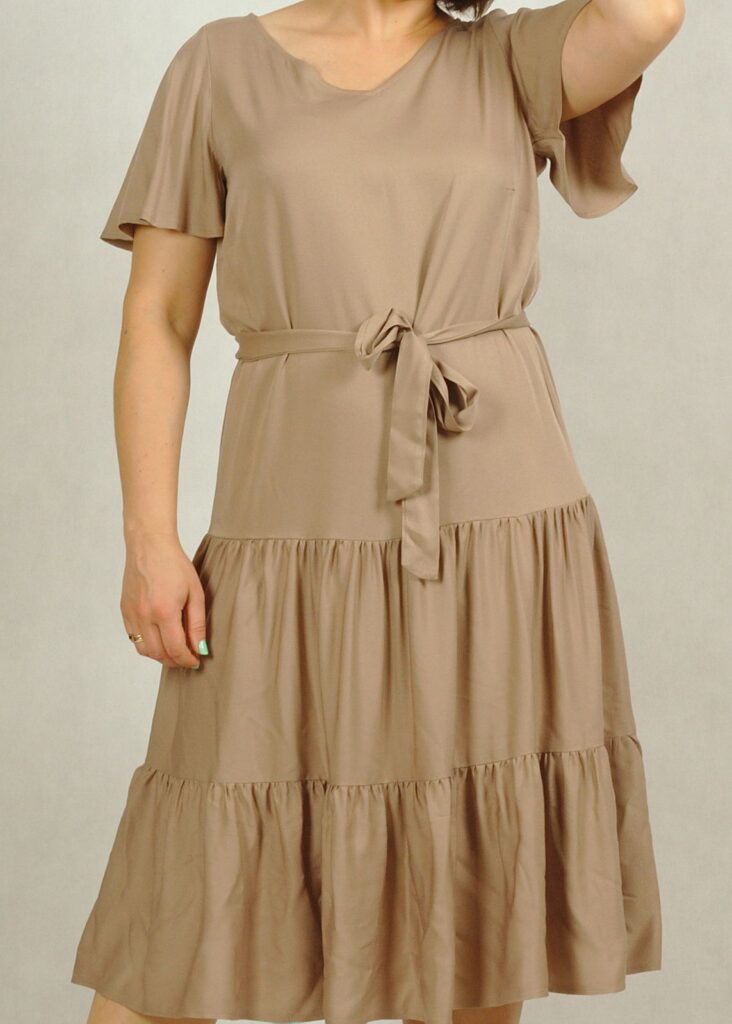 Sukienka posiada pasek wykonany z tej samej tkaniny, co sukienka.