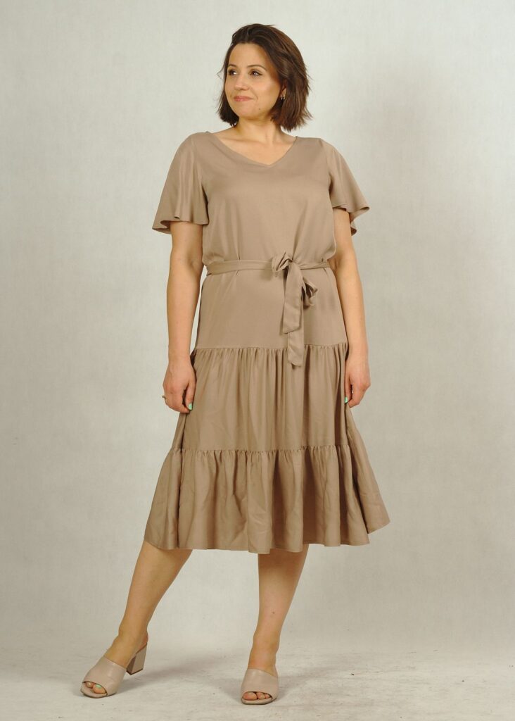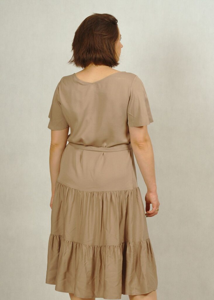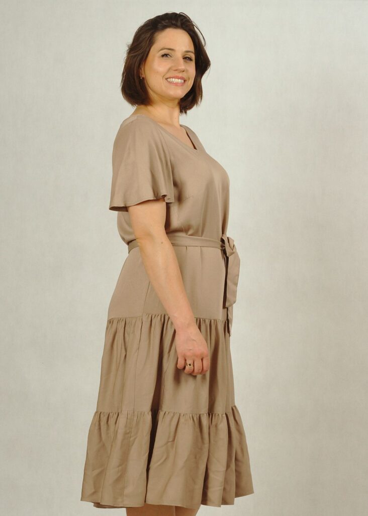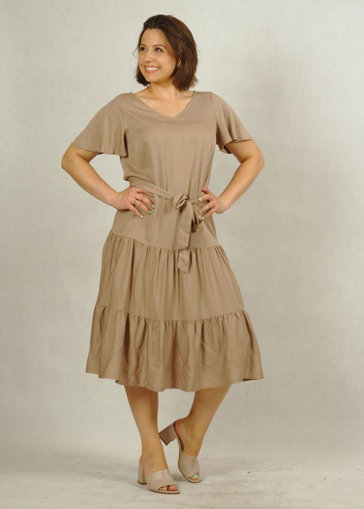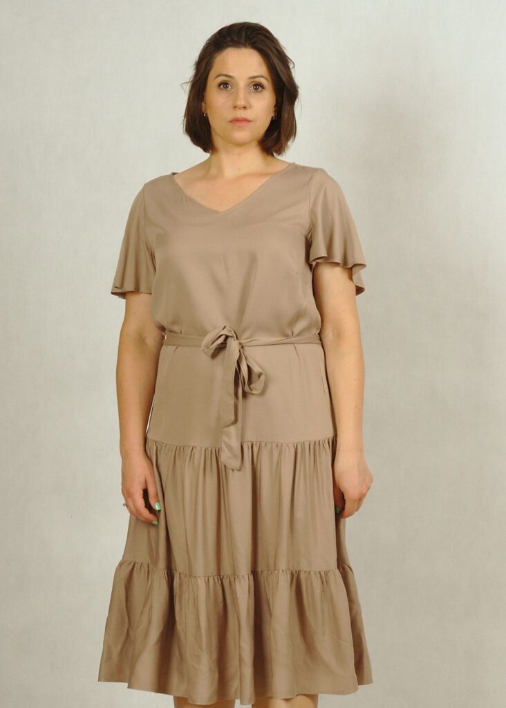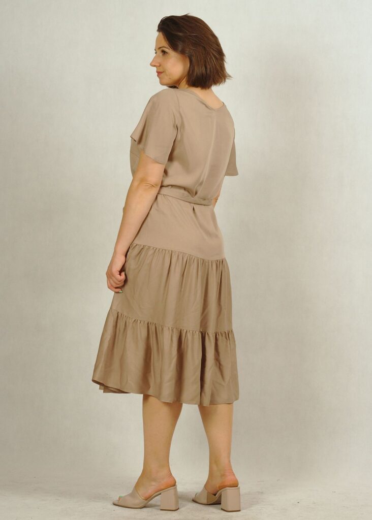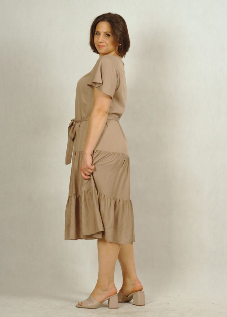 Perfekcyjnie dopracowane szczegóły, takie jak: dekolt w serek, piękny krótki rękawek “motylek” oraz dwie falbany dodają lekkości i elegancji każdej stylizacji, w której występuje ta sukienka.