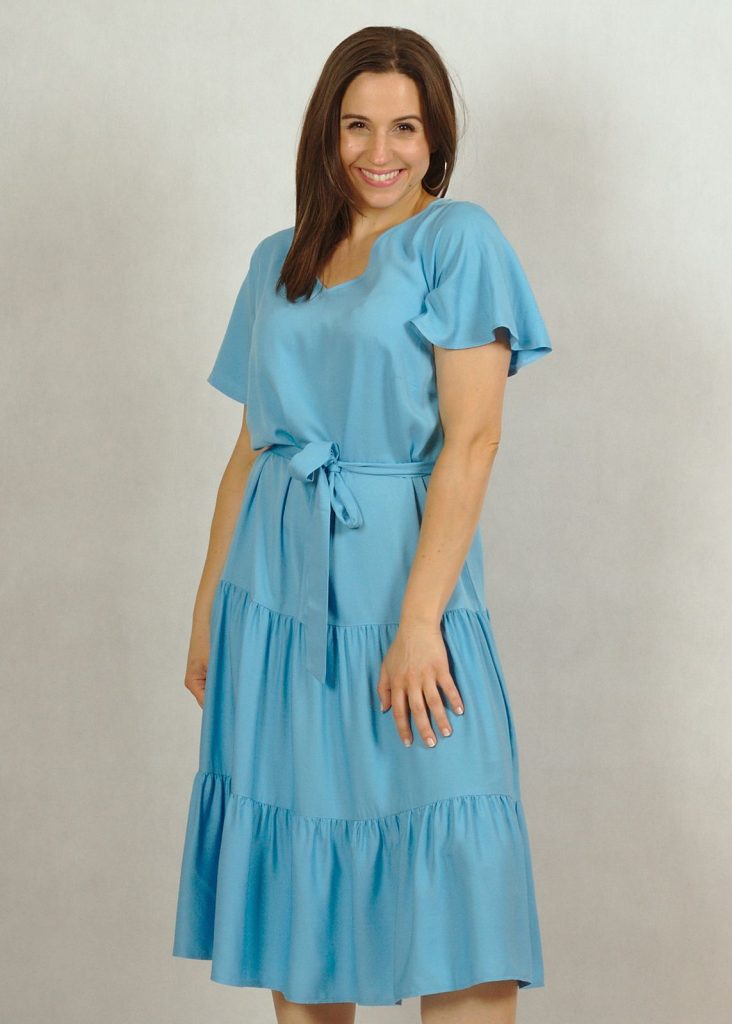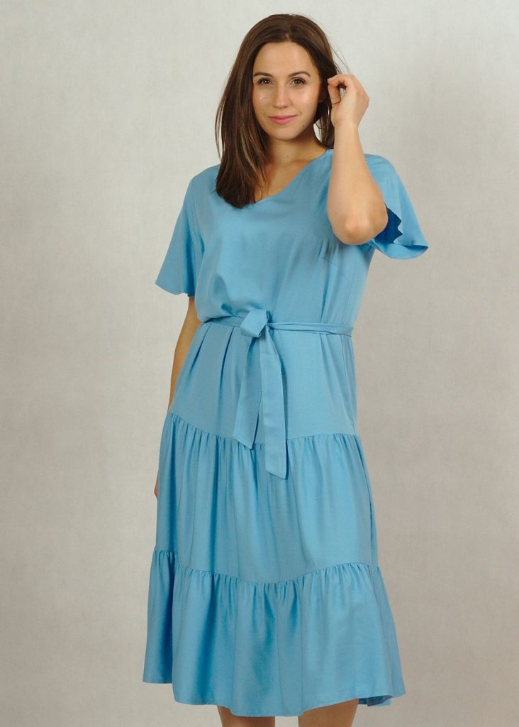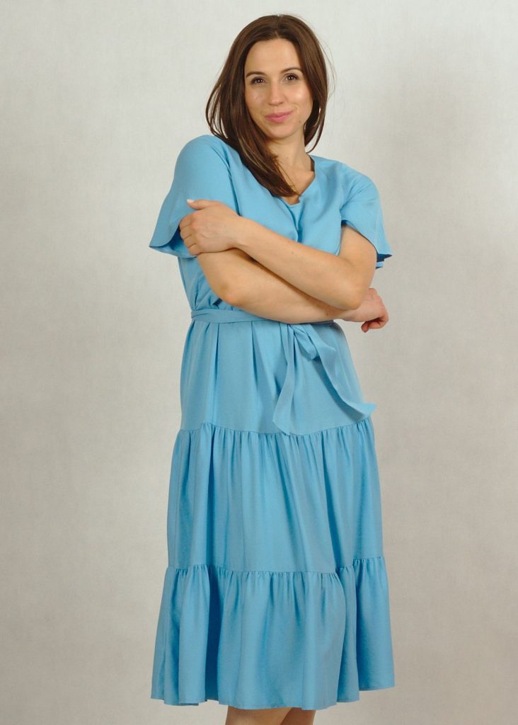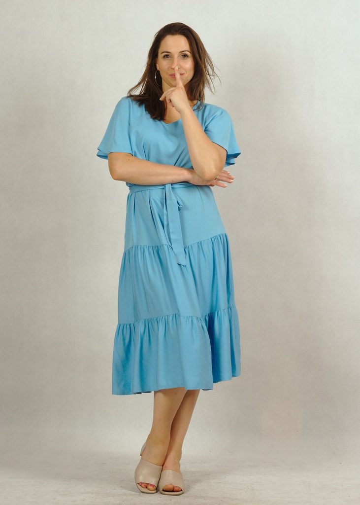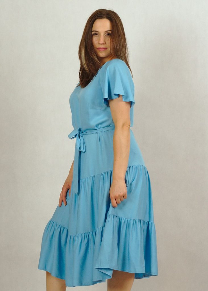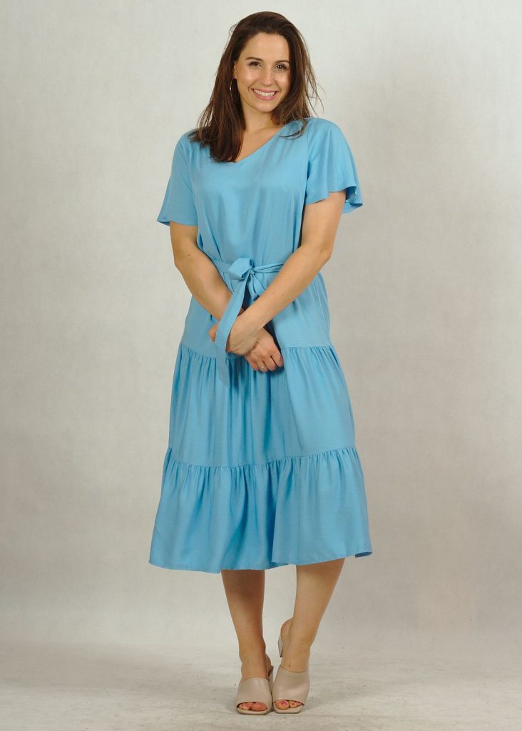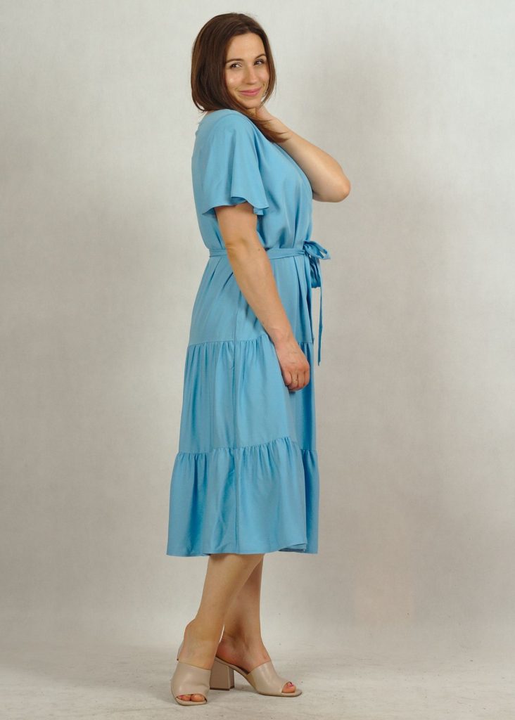 Perfekcyjnie dopracowane szczegóły, takie jak: dekolt w serek, piękny krótki rękawek “motylek” oraz dwie falbany dodają lekkości i elegancji każdej stylizacji, w której występuje ta sukienka.