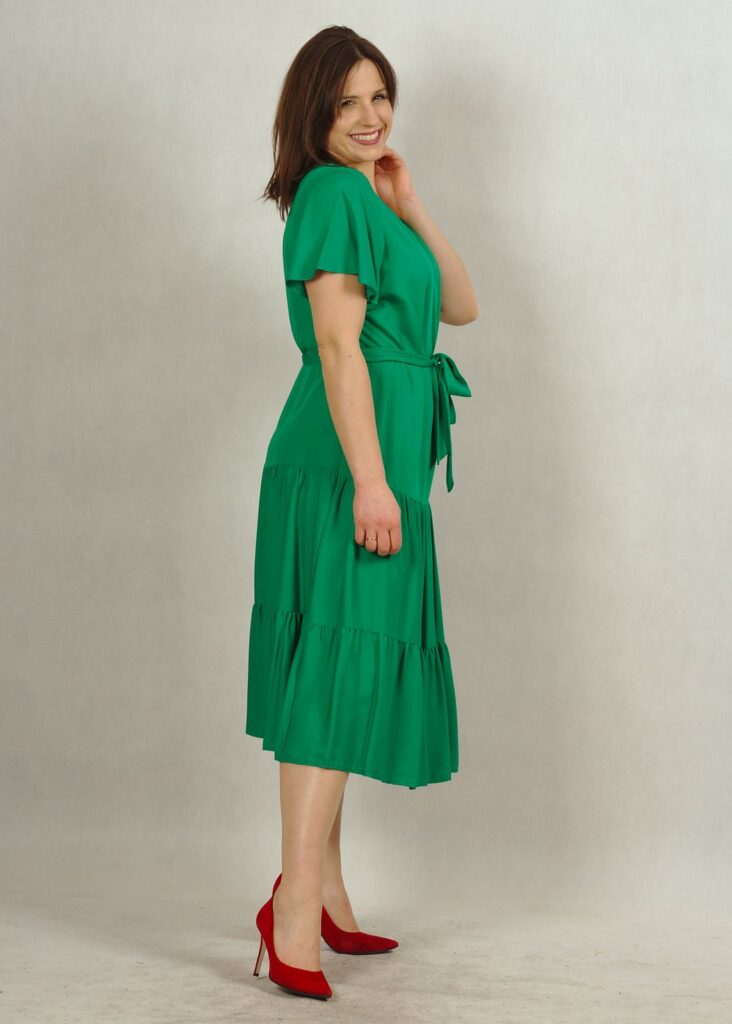 Perfekcyjnie dopracowane szczegóły, takie jak: dekolt w serek, piękny krótki rękawek “motylek” oraz dwie falbany dodają lekkości i elegancji każdej stylizacji, w której występuje ta sukienka.