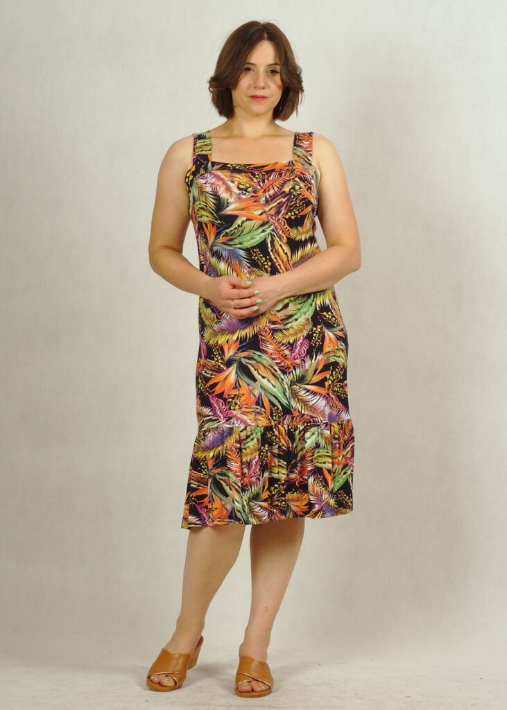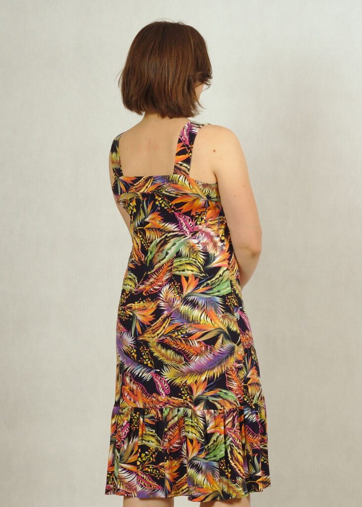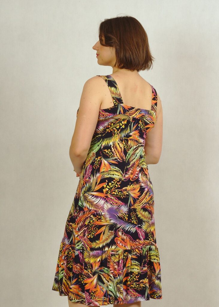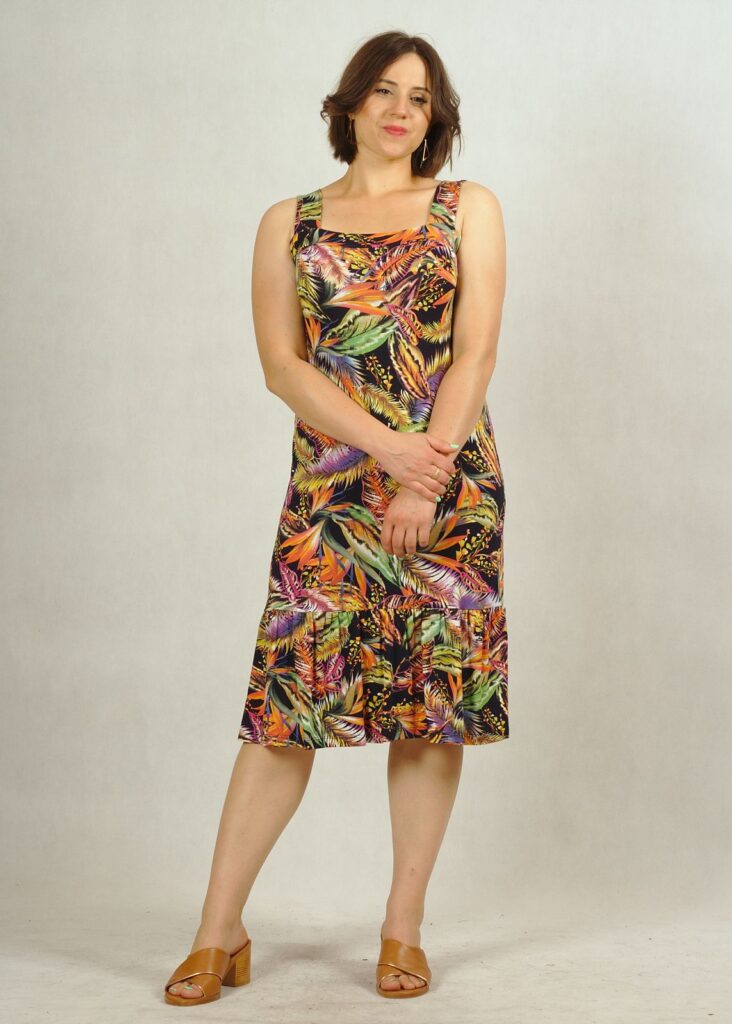 Bardzo ciekawa propozycja od Damy – sukienka na ramiączkach, z dekoltem w karo i świetną falbanką na dole.