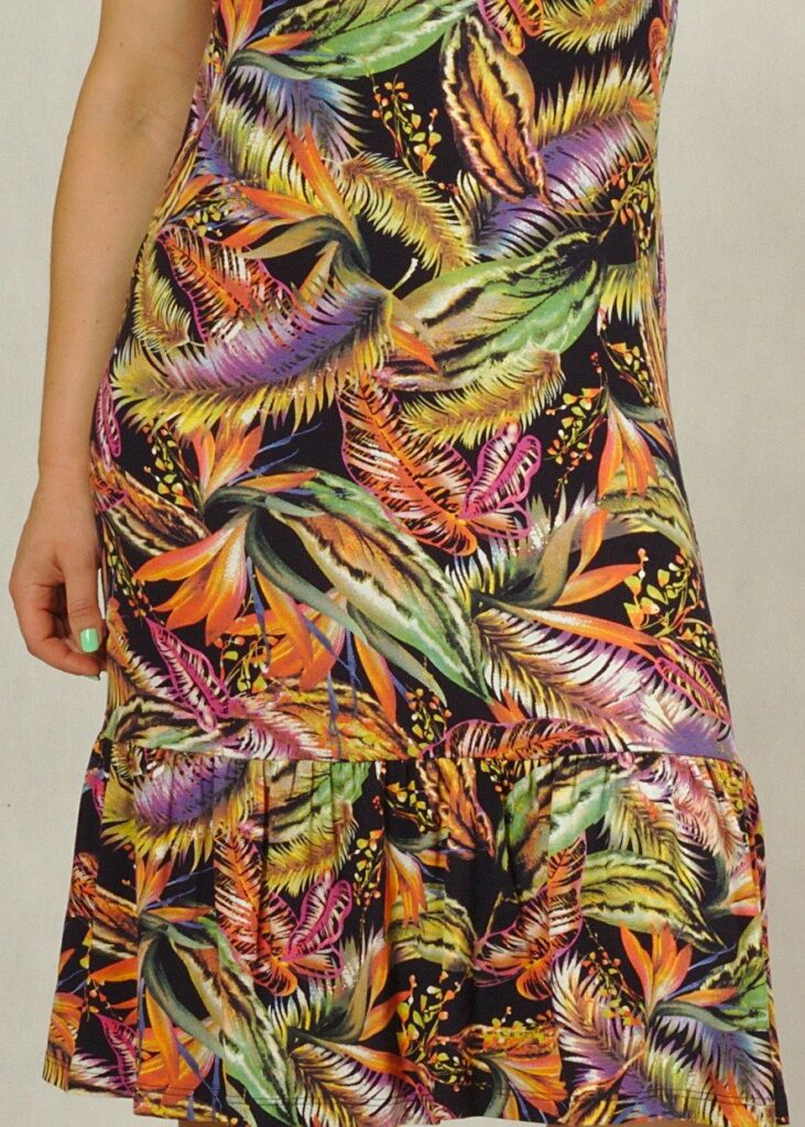 Sukienka ma prosty fason, charakteru dodaje jej falbanka.