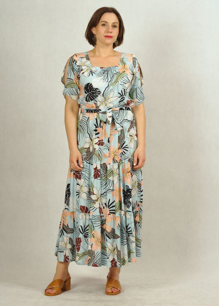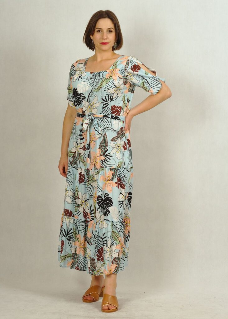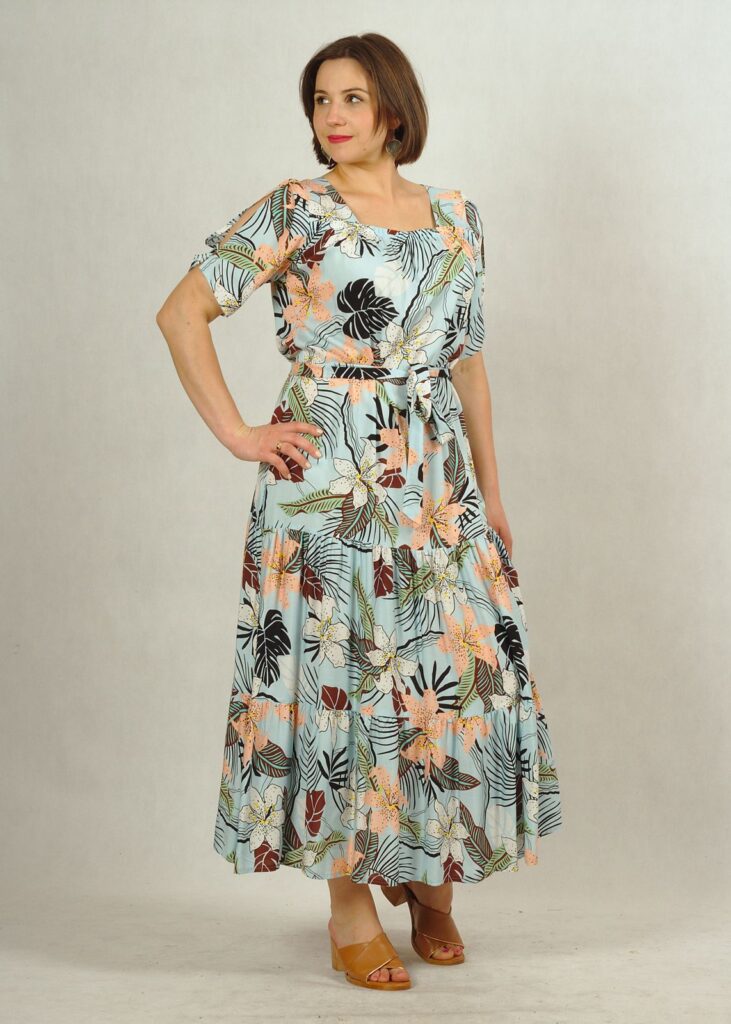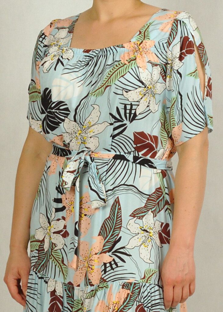 Sukienka ma pasek wykonany z tej samej tkaniny wiskozowej (wiskoza 100%!), co sukienka. Dodawany jest oddzielnie. Nie ma szlufek.