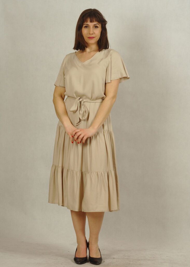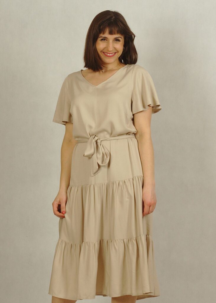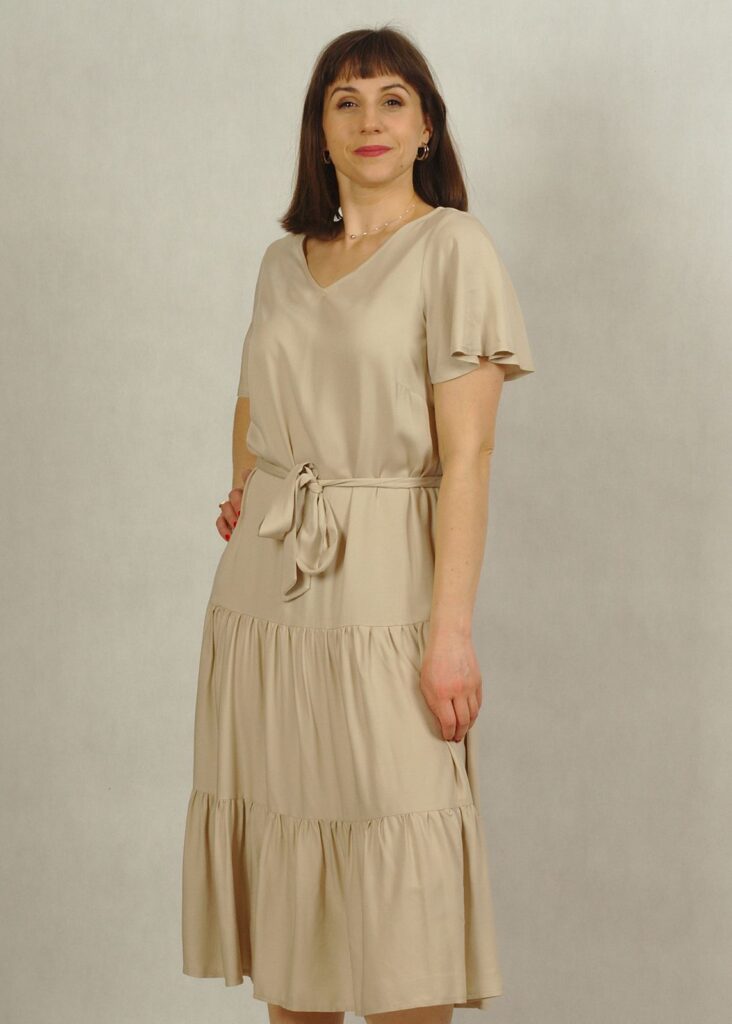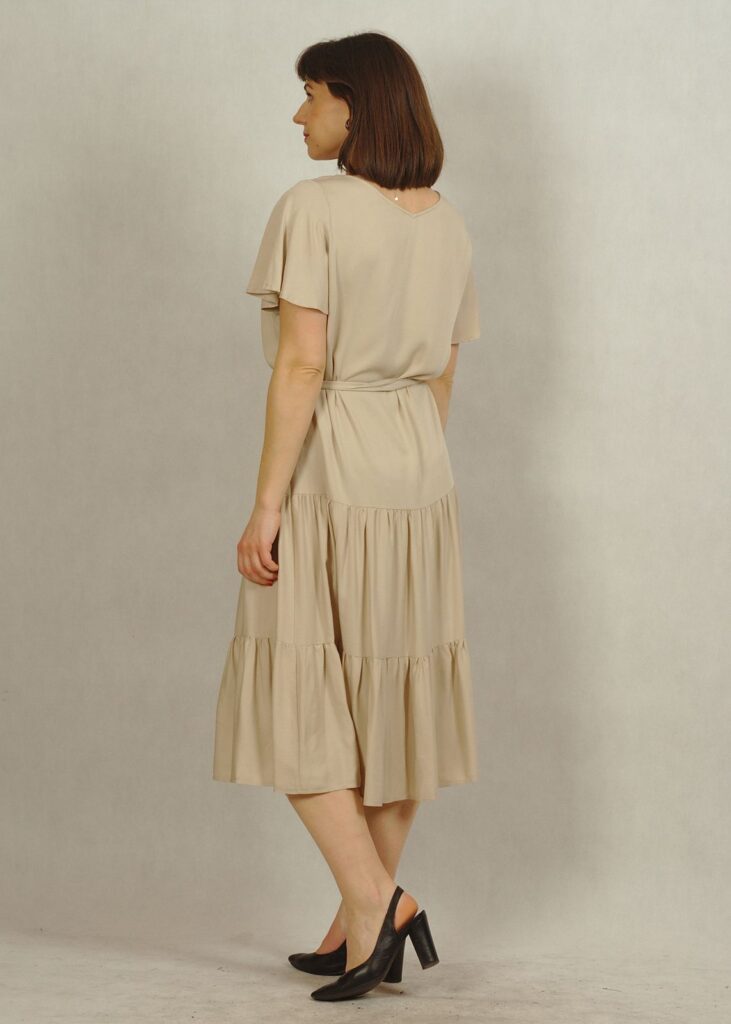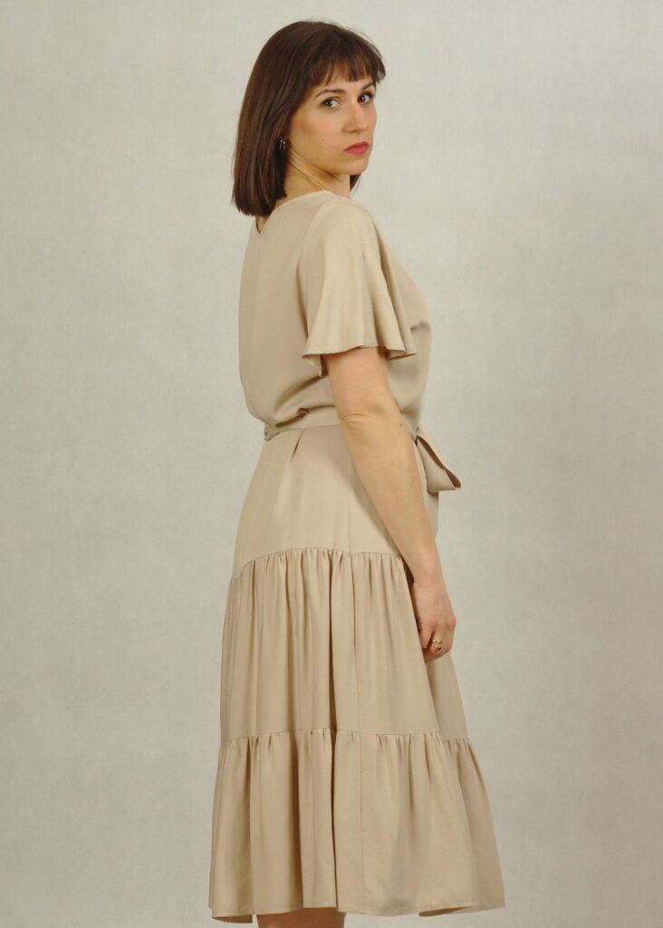 Perfekcyjnie dopracowane szczegóły, takie jak: dekolt w serek, piękny krótki rękawek “motylek” oraz dwie falbany dodają lekkości i elegancji każdej stylizacji, w której występuje ta sukienka.