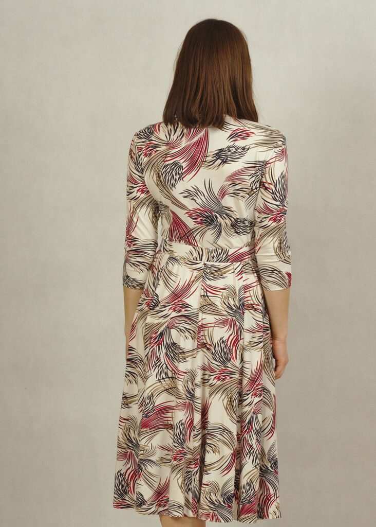 Sukienka ecru w bordowe i granatowe wzory.