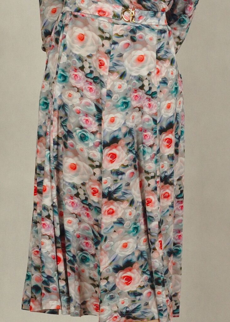 Dół sukienki lekko się rozszerza dzięki wszytym klinom, co nadaje jej lekkości i kobiecego uroku.