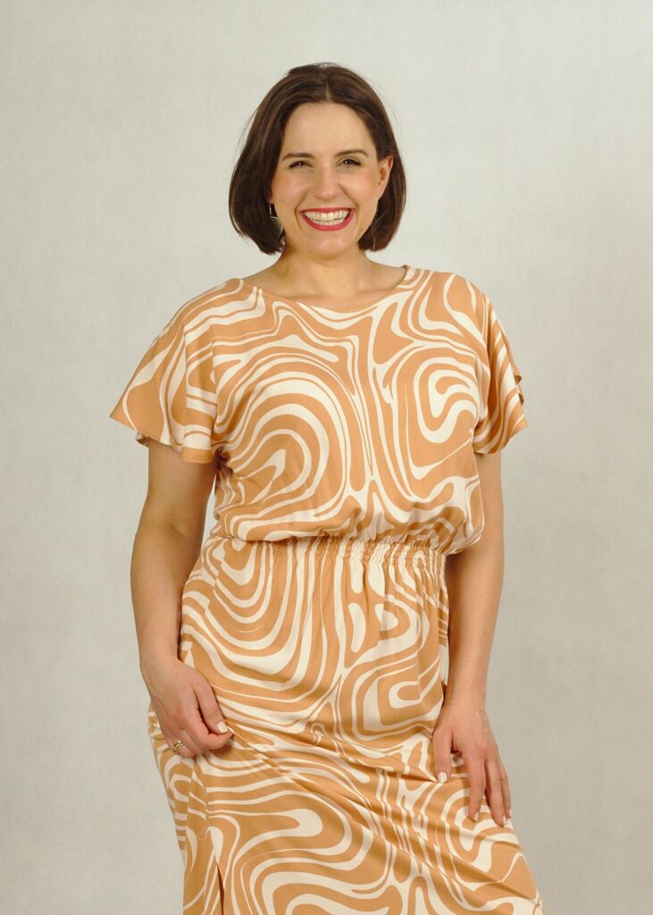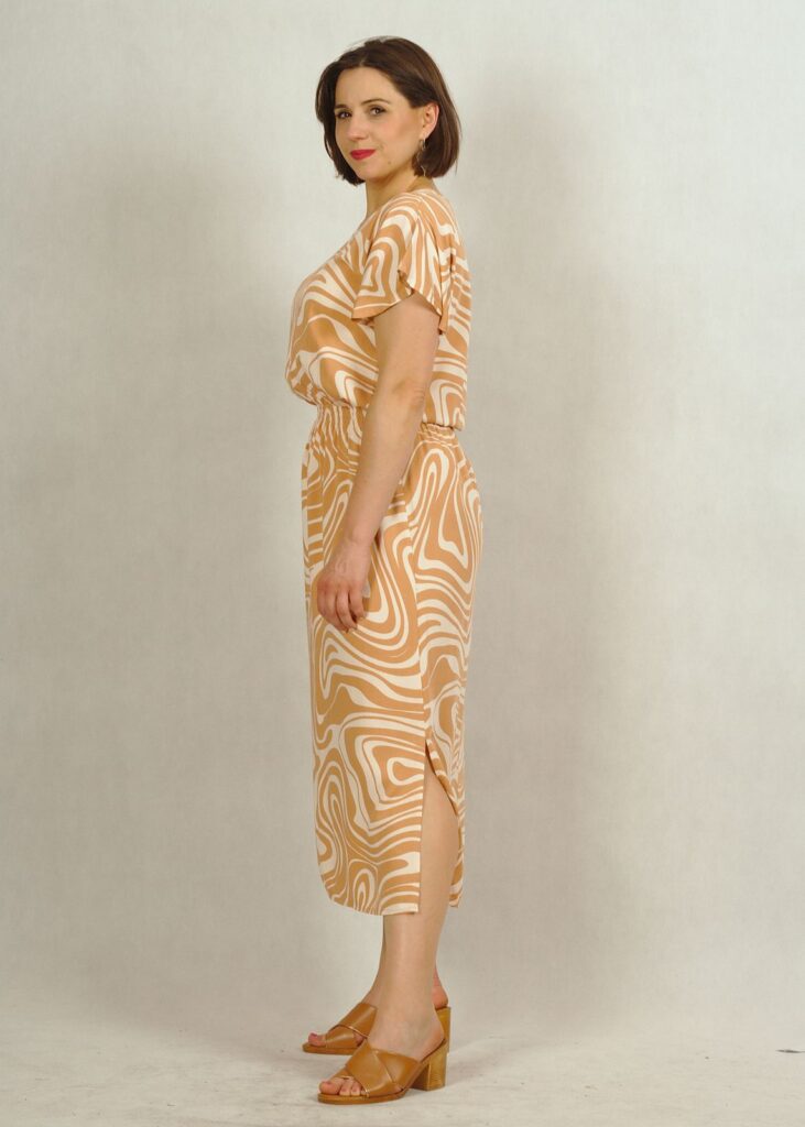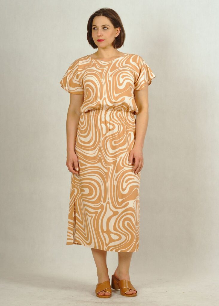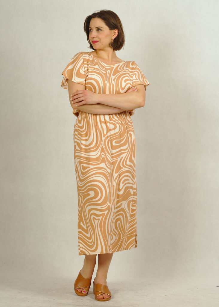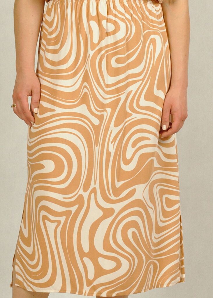 Sukienka uszyta z wielką dbałością o szczegóły i w bardzo ciekawym wzorze. Beżowe fale delikatnie przeplatają się z kolorem bazowym – ecru*.
