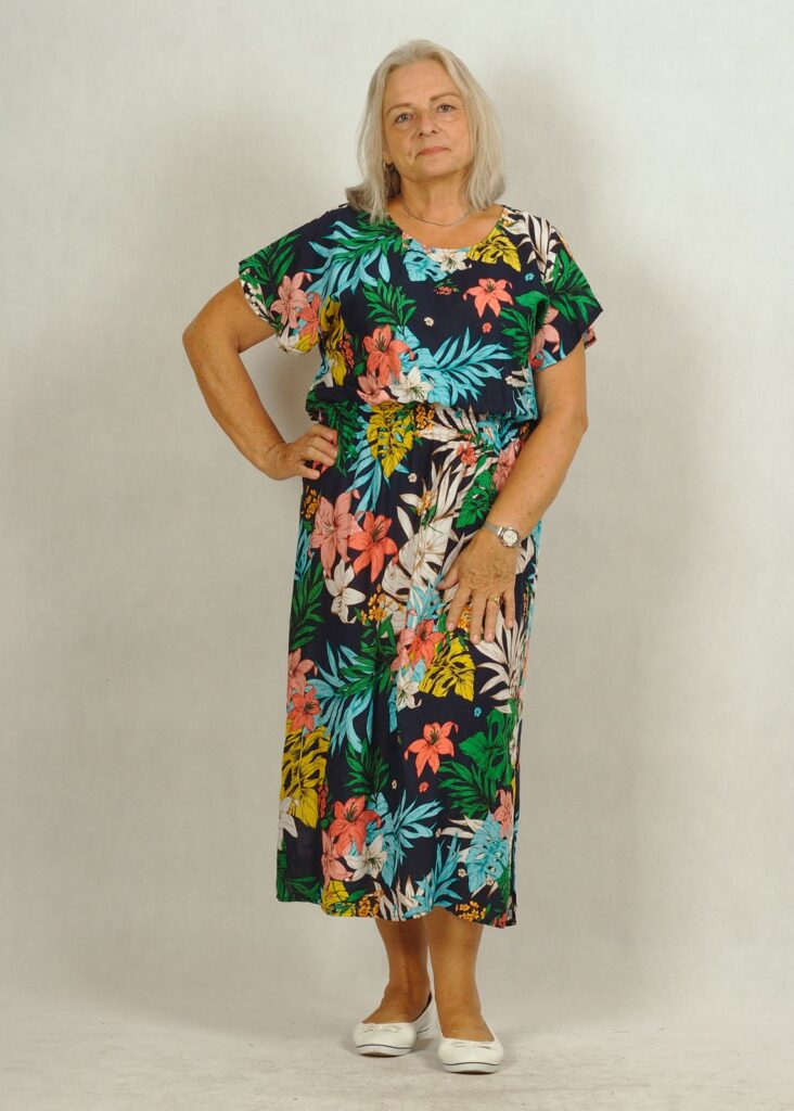 Tło sukienki jest granatowe*.