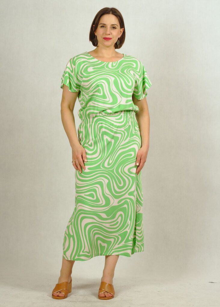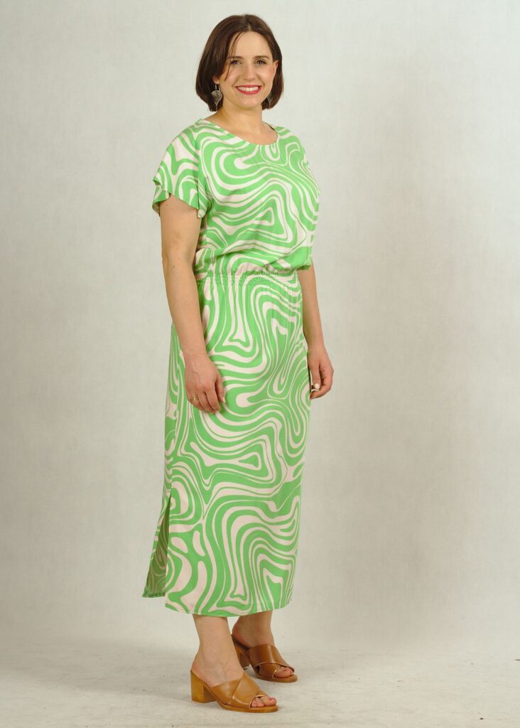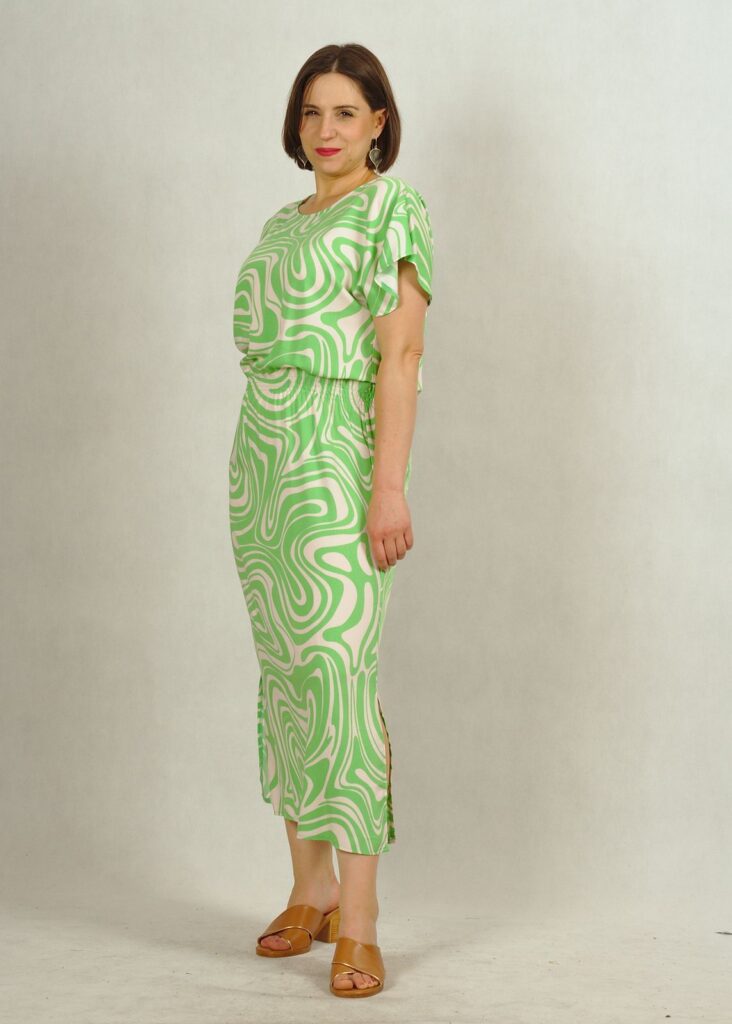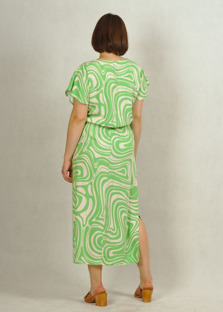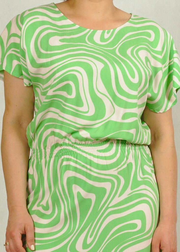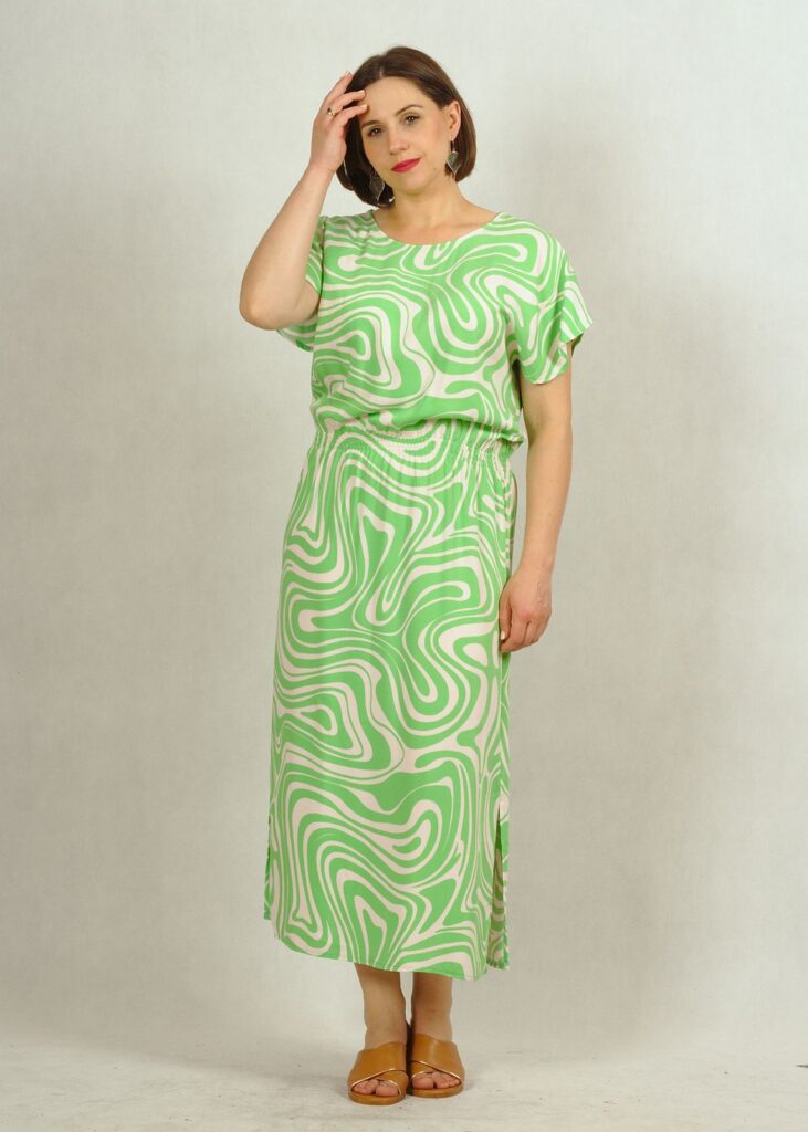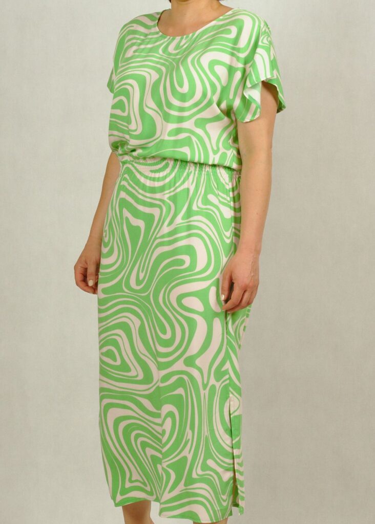 Sukienka uszyta z wielką dbałością o szczegóły i w bardzo ciekawym wzorze. Zielone fale delikatnie przeplatają się z kolorem bazowym – ecru*.