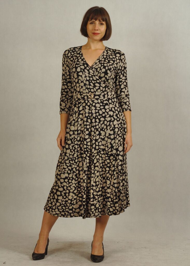 Sukienka midi czarna w beżowe wzorki z połyskiem, to propozycja, która łączy w sobie elegancję i wygodę.