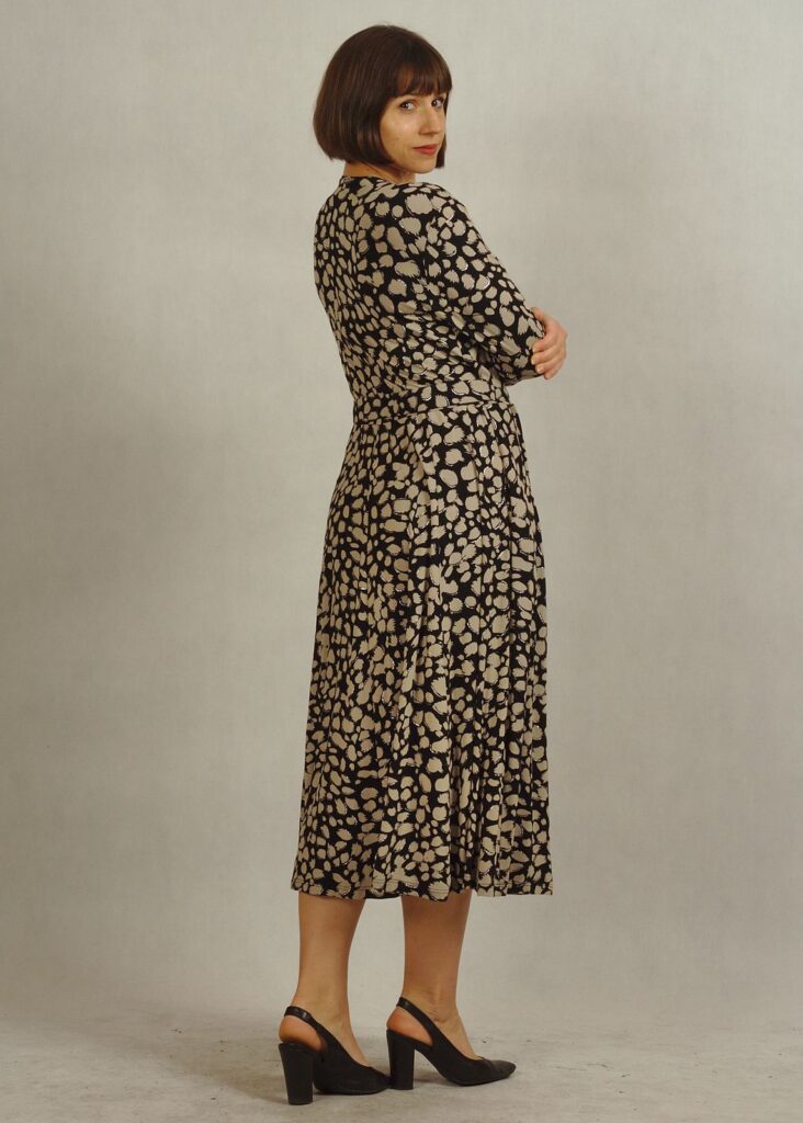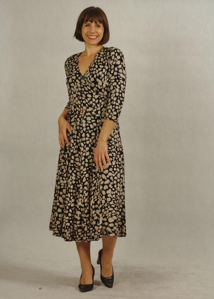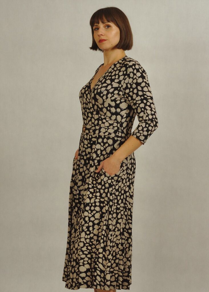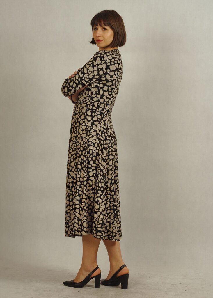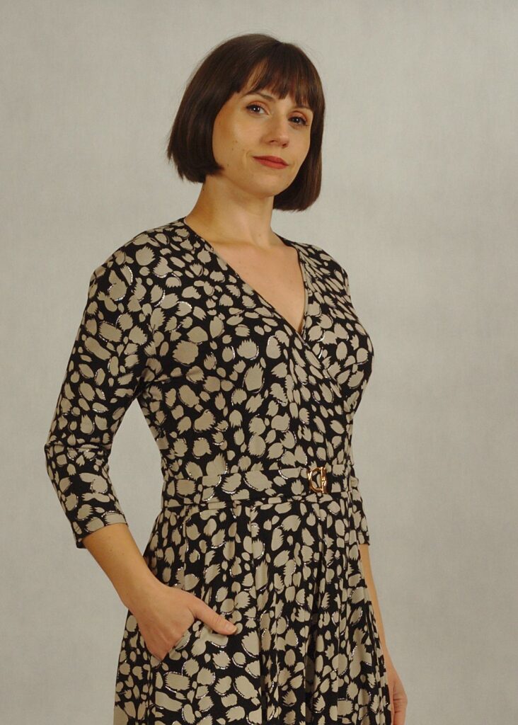 Sukienka z kopertowym dekoltem optycznie wysmukla figurę i pięknie eksponuje kobiece atuty.