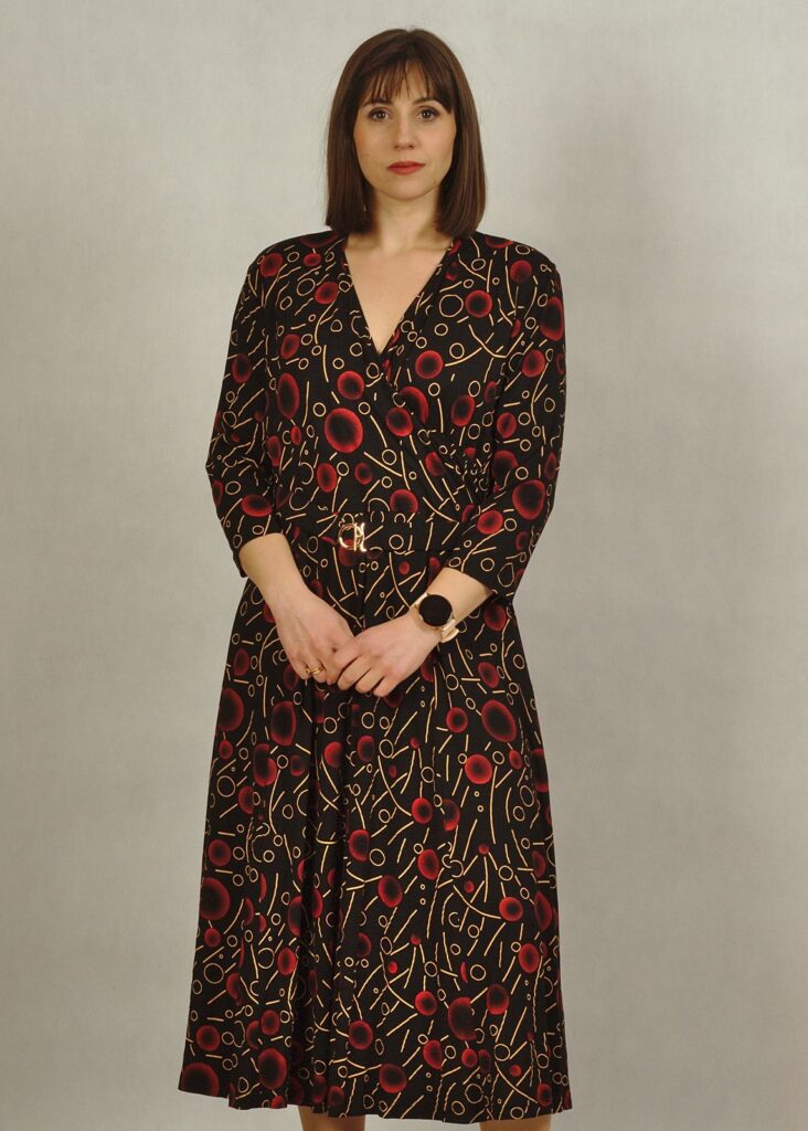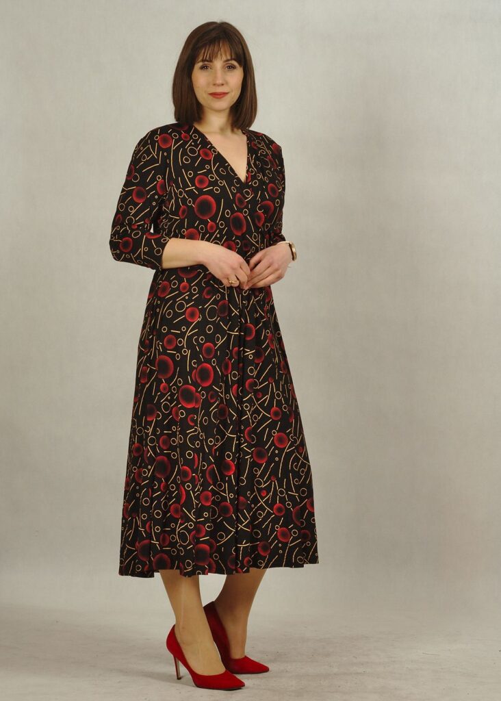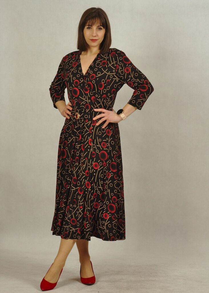 Sukienka midi czarna w bordo wzorki to piękna propozycja na nadchodzący czas.