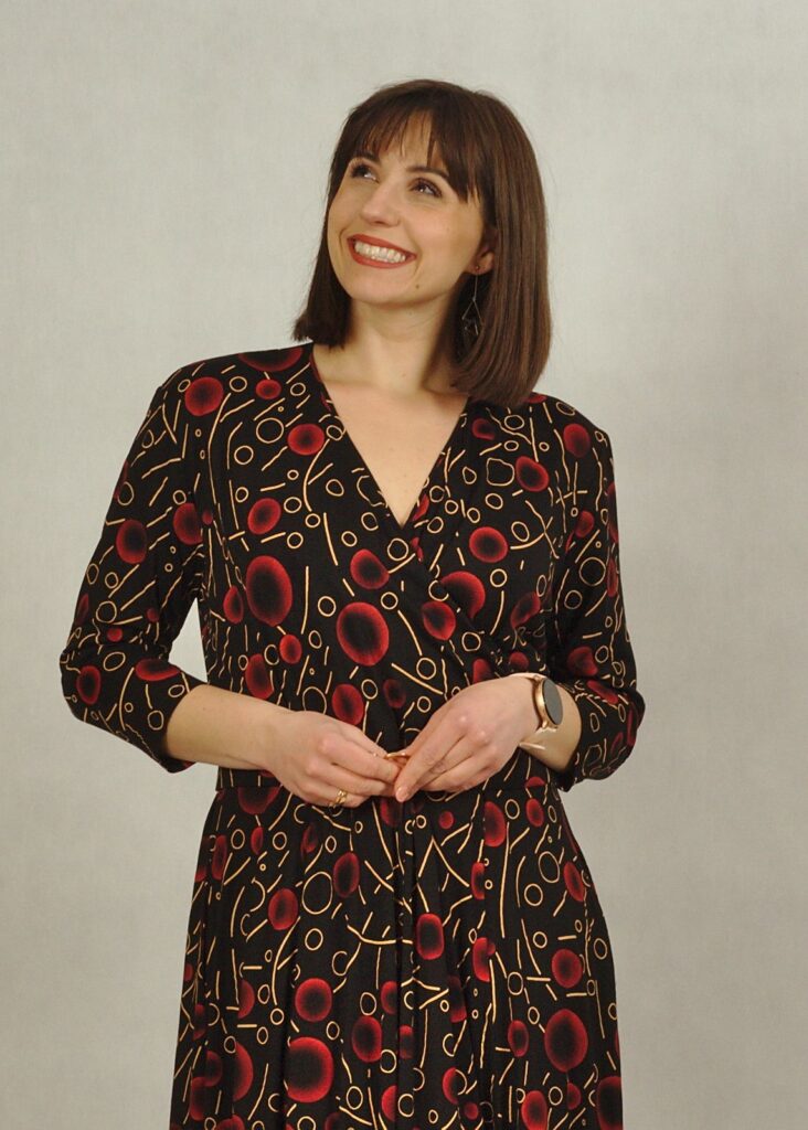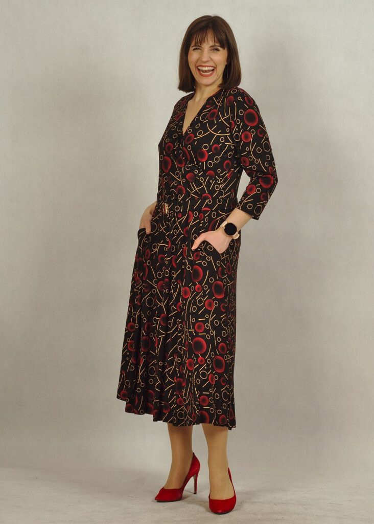 Sukienka z kieszeniami to wygoda. Kopertowy dekolt idealnie pasuje do Kobiet o większym biuście.