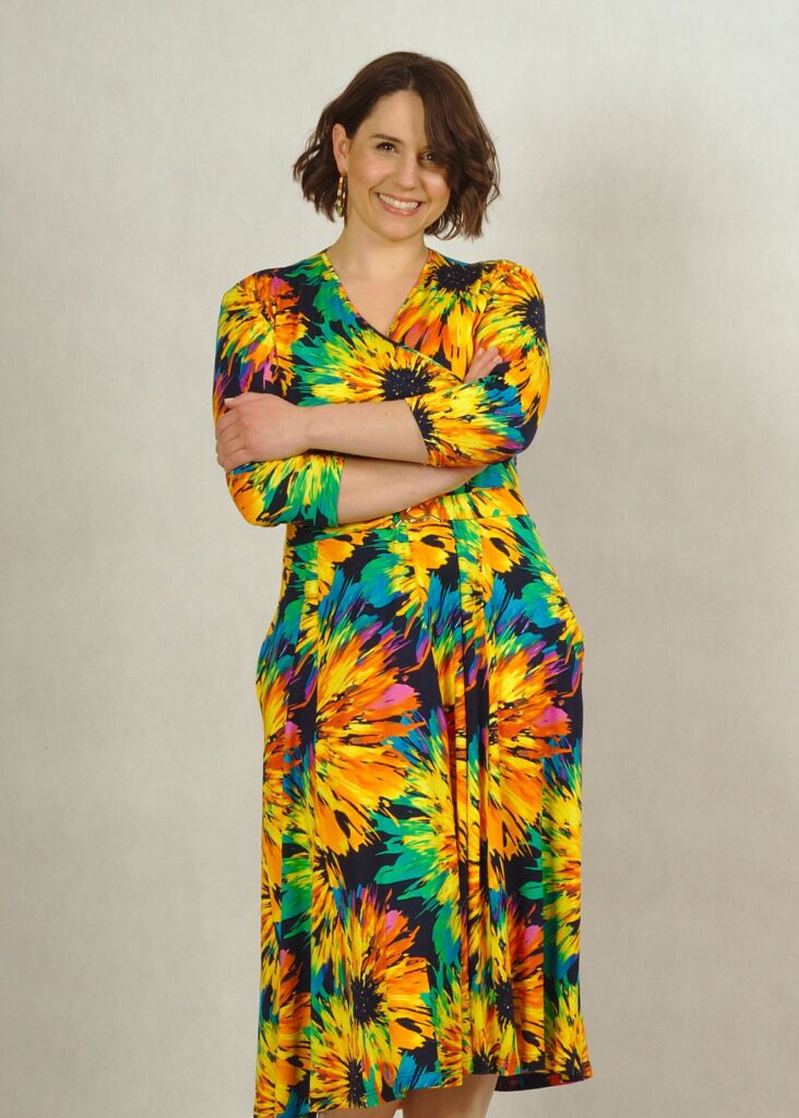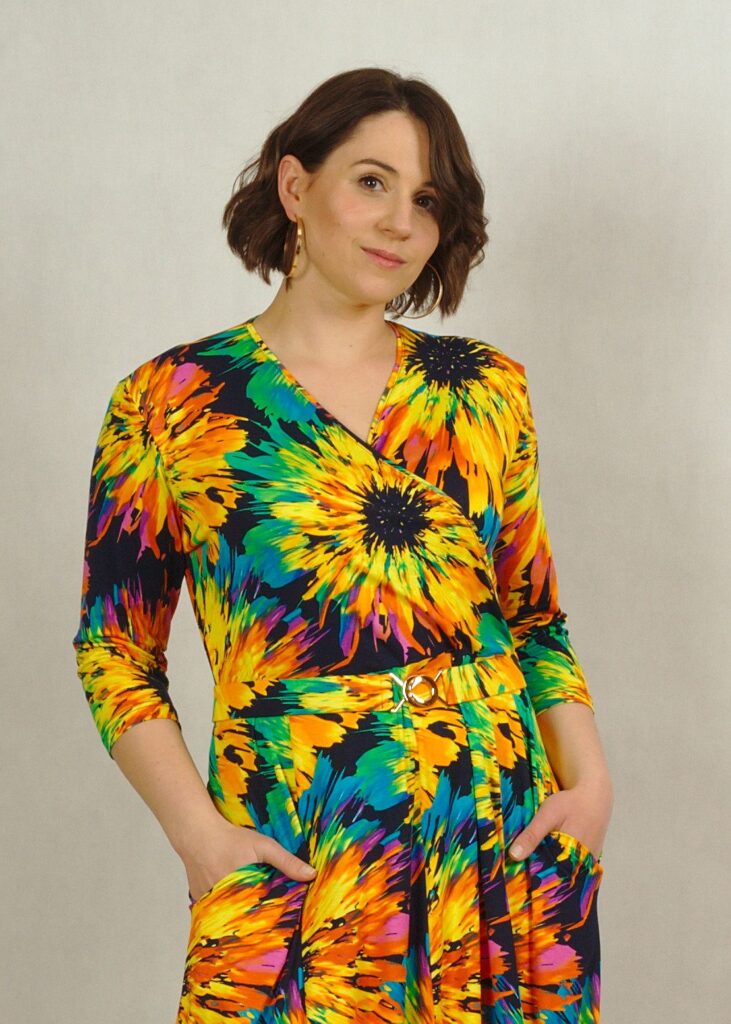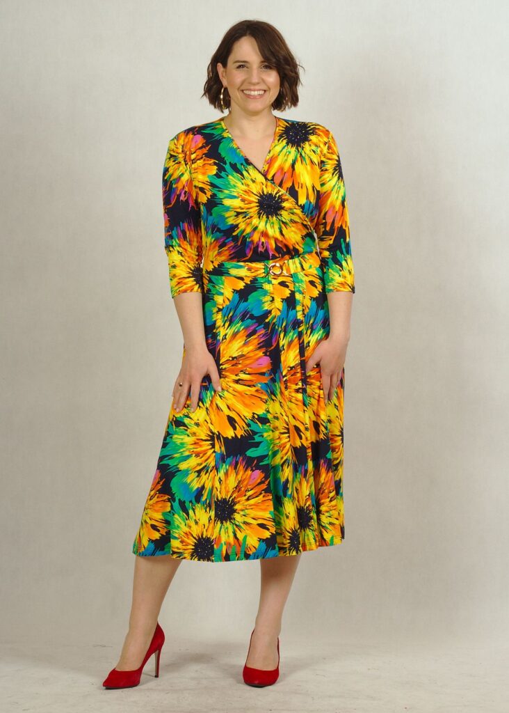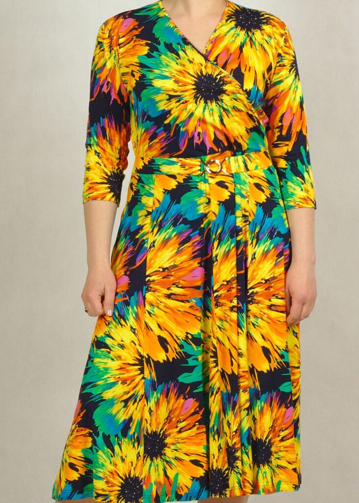 Sukienka jest wielokolorowa w duże żółte kwiaty słonecznika – wzór tuszuje absolutnie wszystkie niedoskonałości figury. Przeważający kolor to żółty*.