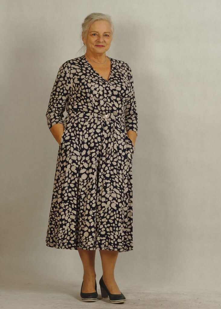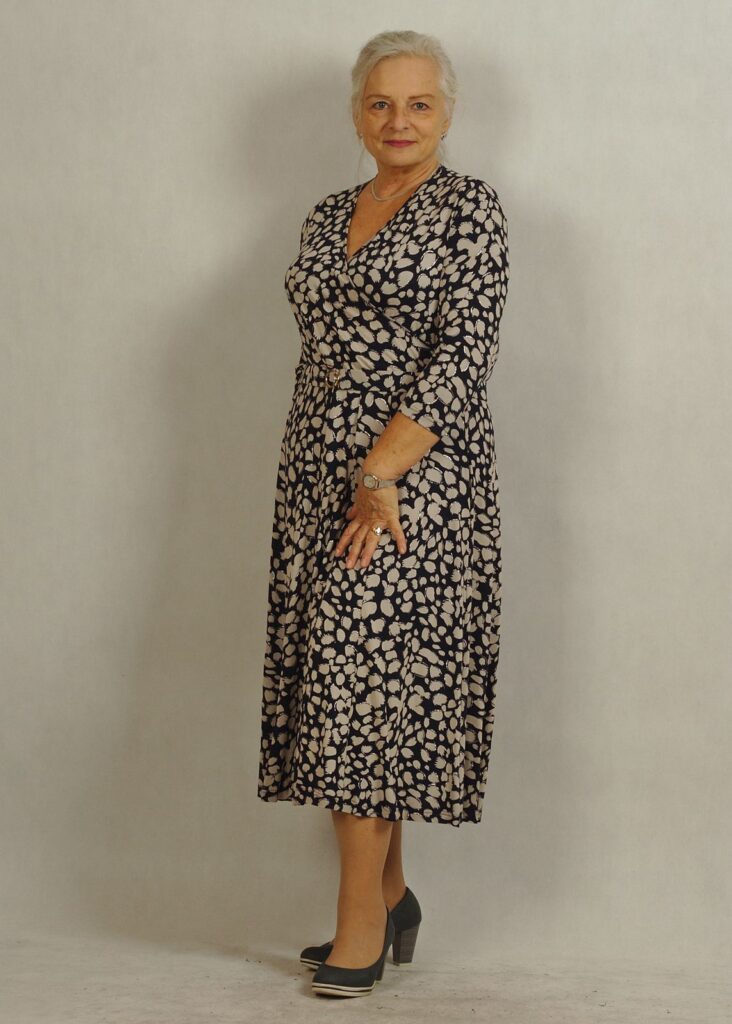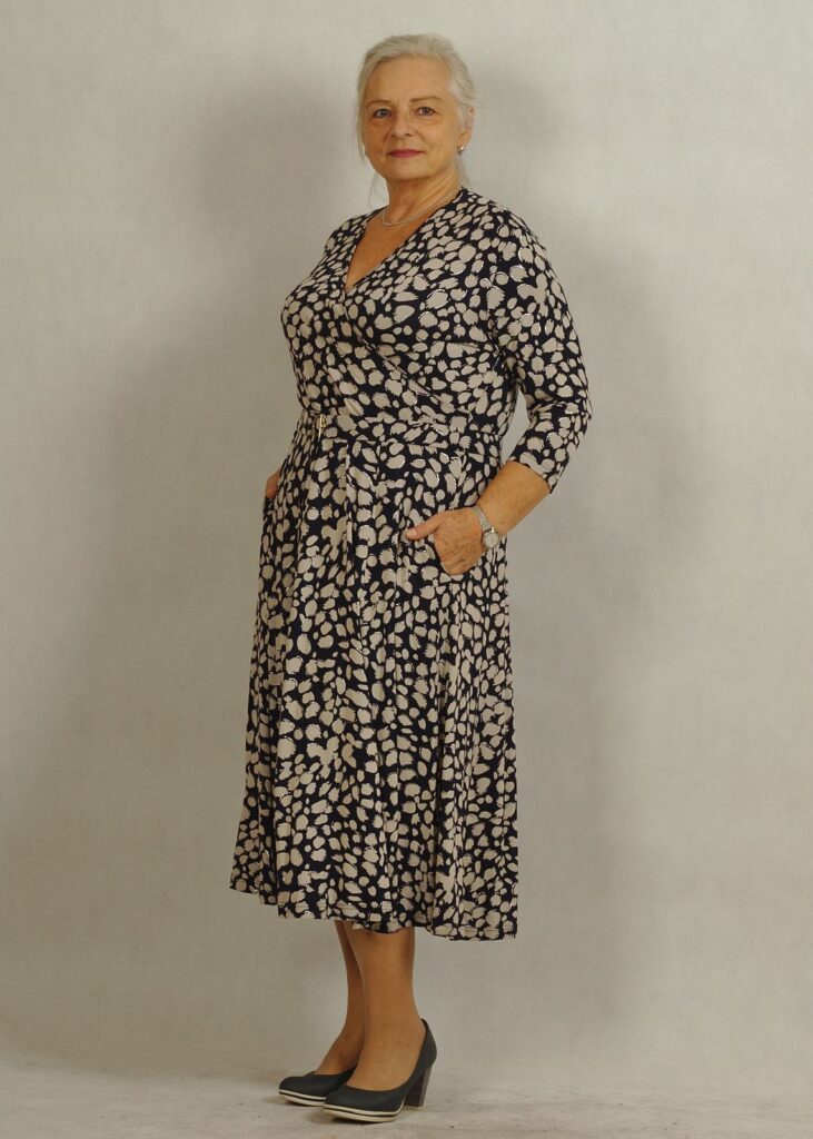 Elegancka sukienka z kopertowym dekoltem świetnie komponuje się z dodatkami, pozwalając tworzyć stylizacje wieczorowe i biznesowe.
