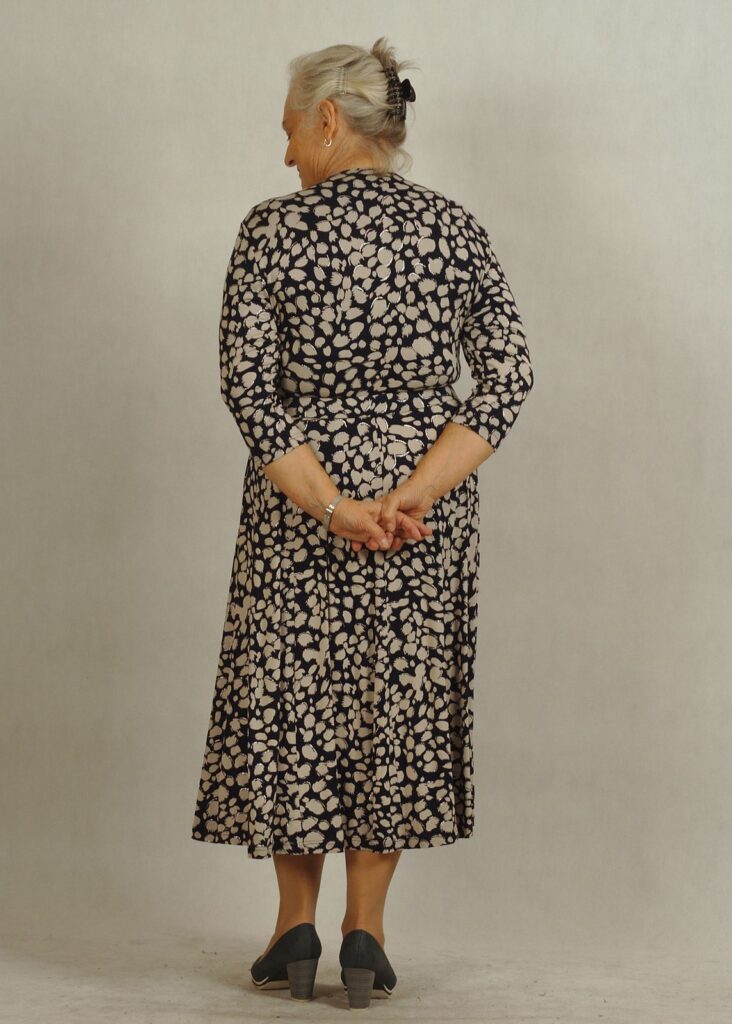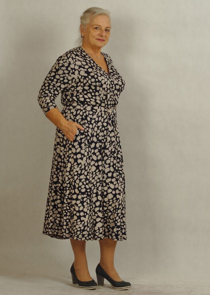 Ta sukienka we wzory doskonale sprawdzi się zarówno na co dzień, jak i w bardziej oficjalnych stylizacjach.