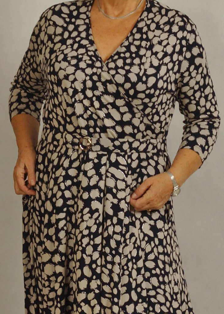 Sukienka z kopertowym dekoltem optycznie wysmukla figurę i pięknie eksponuje kobiece atuty.