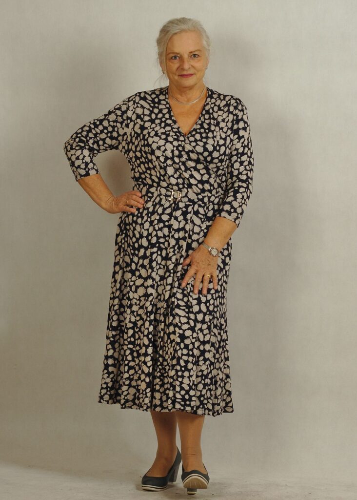 Sukienka ciemna, urozmaicona delikatnymi kontrastami, podkreśla sylwetkę, a jednocześnie pozostaje niezwykle komfortowa.