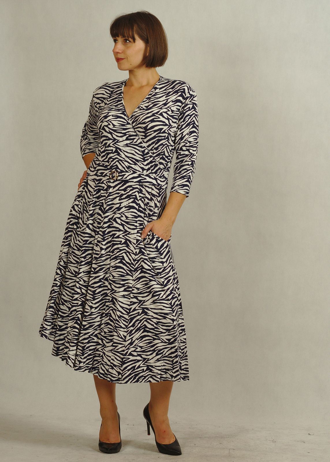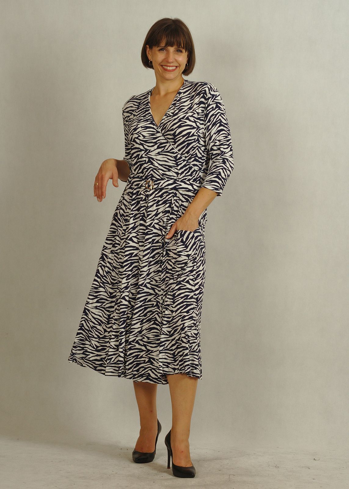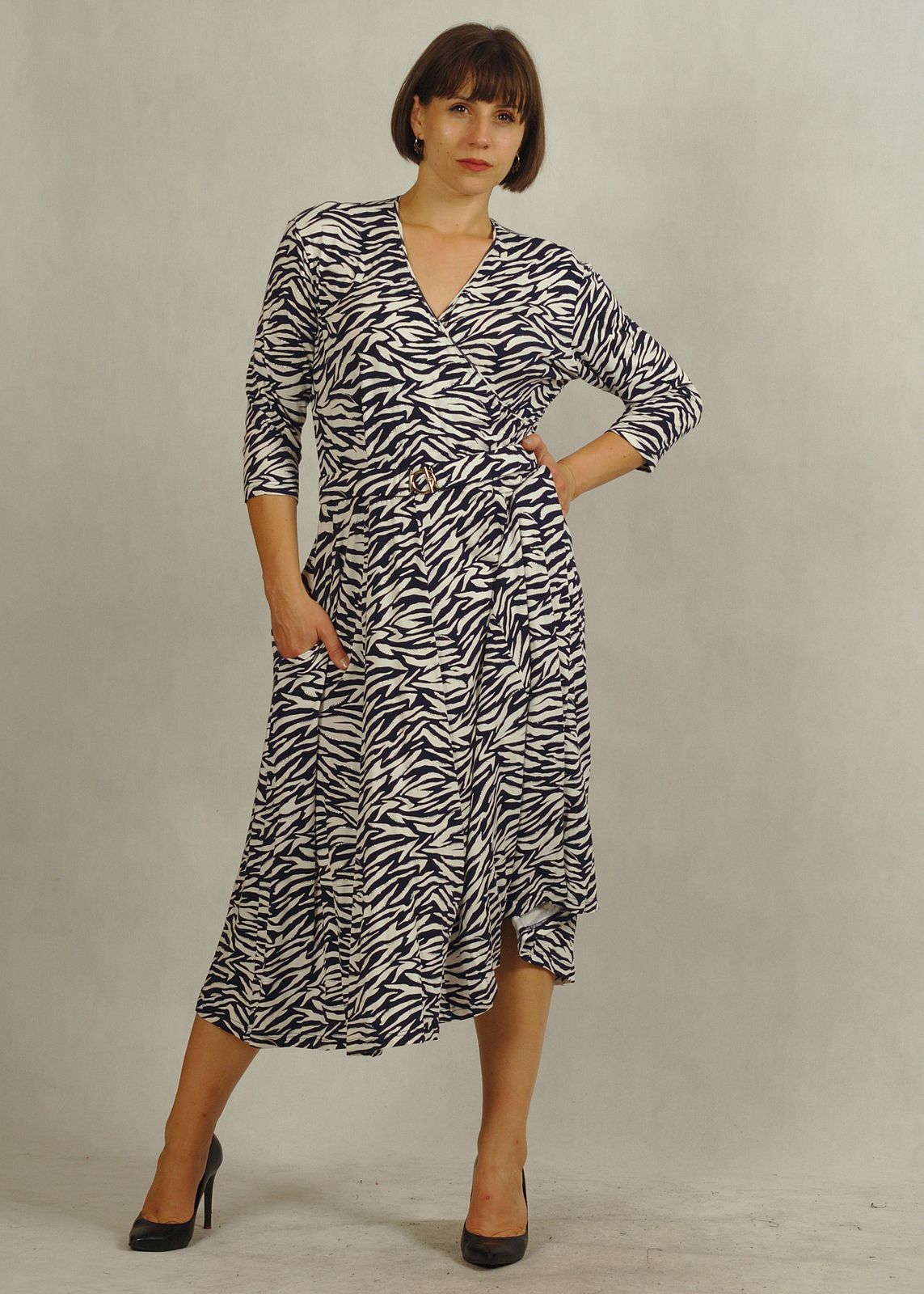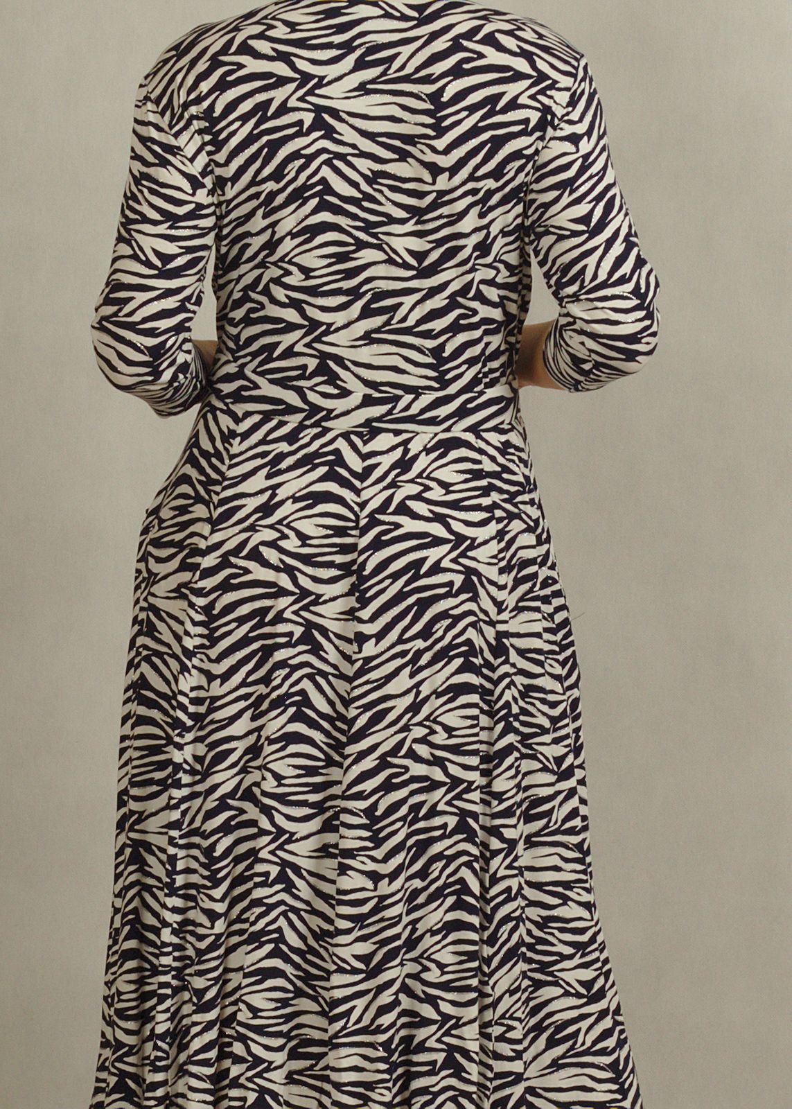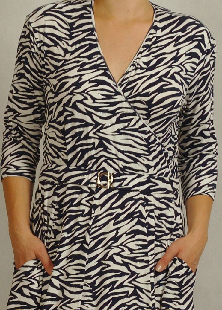 Sukienka midi z kopertowym dekoltem granatowo-biała zebra z połyskiem /757/
