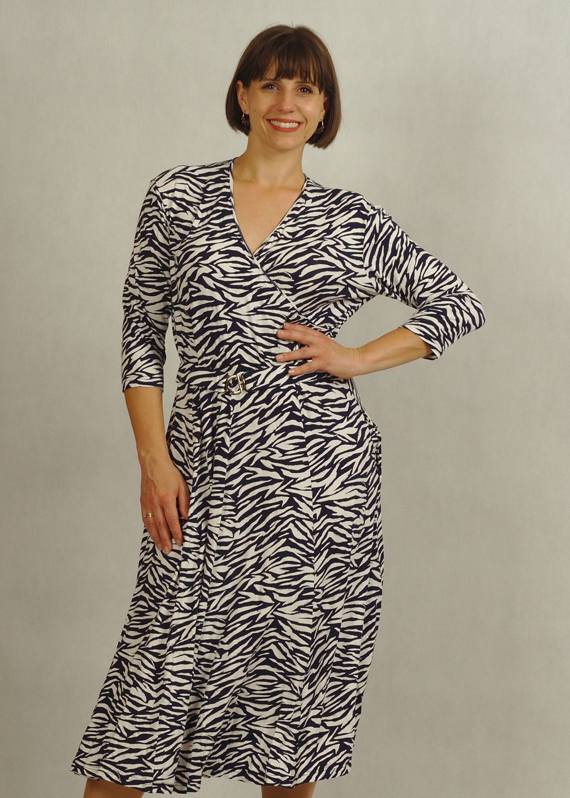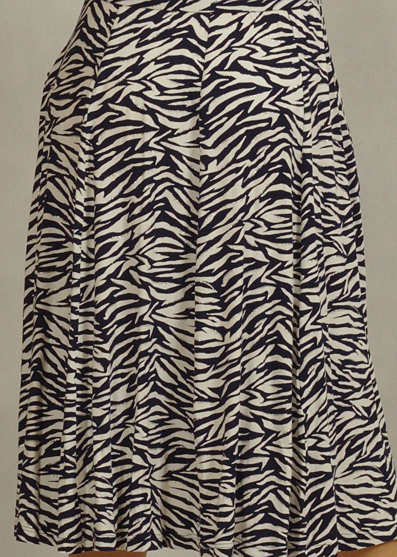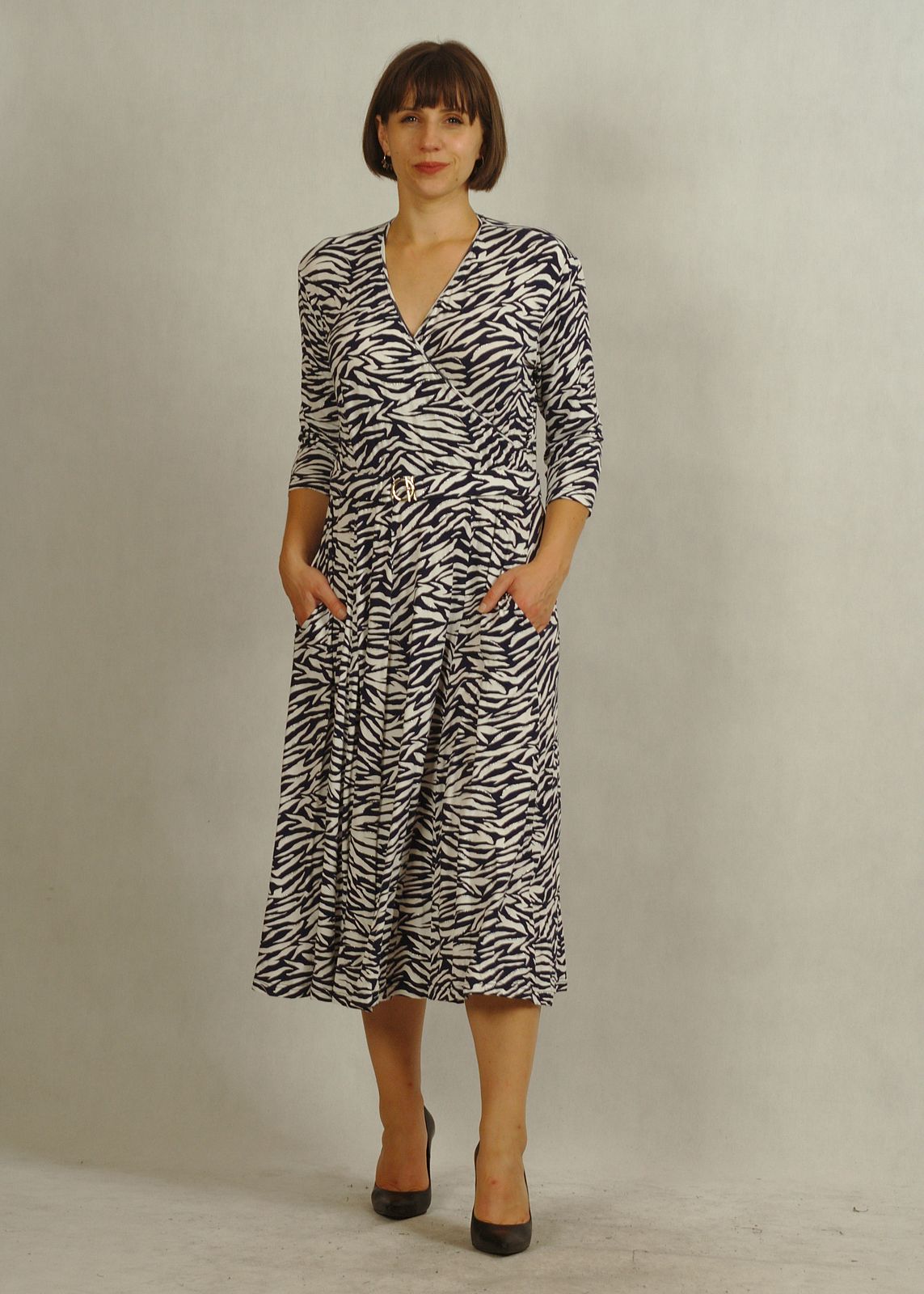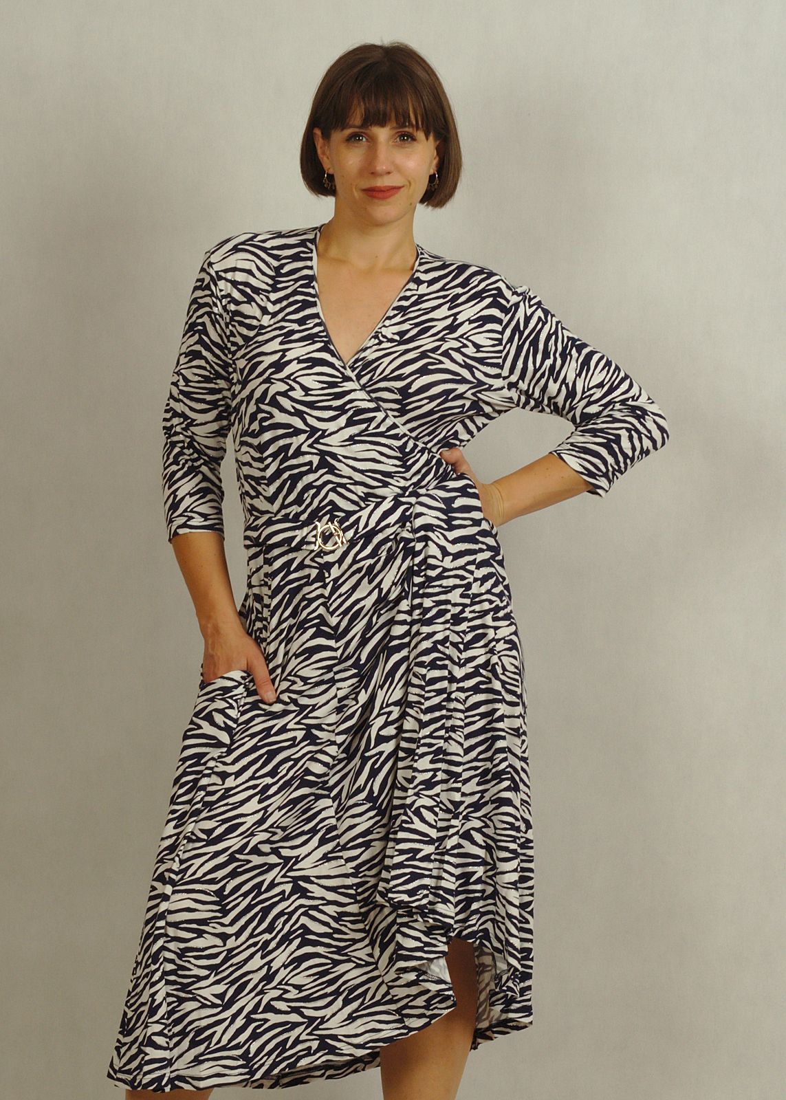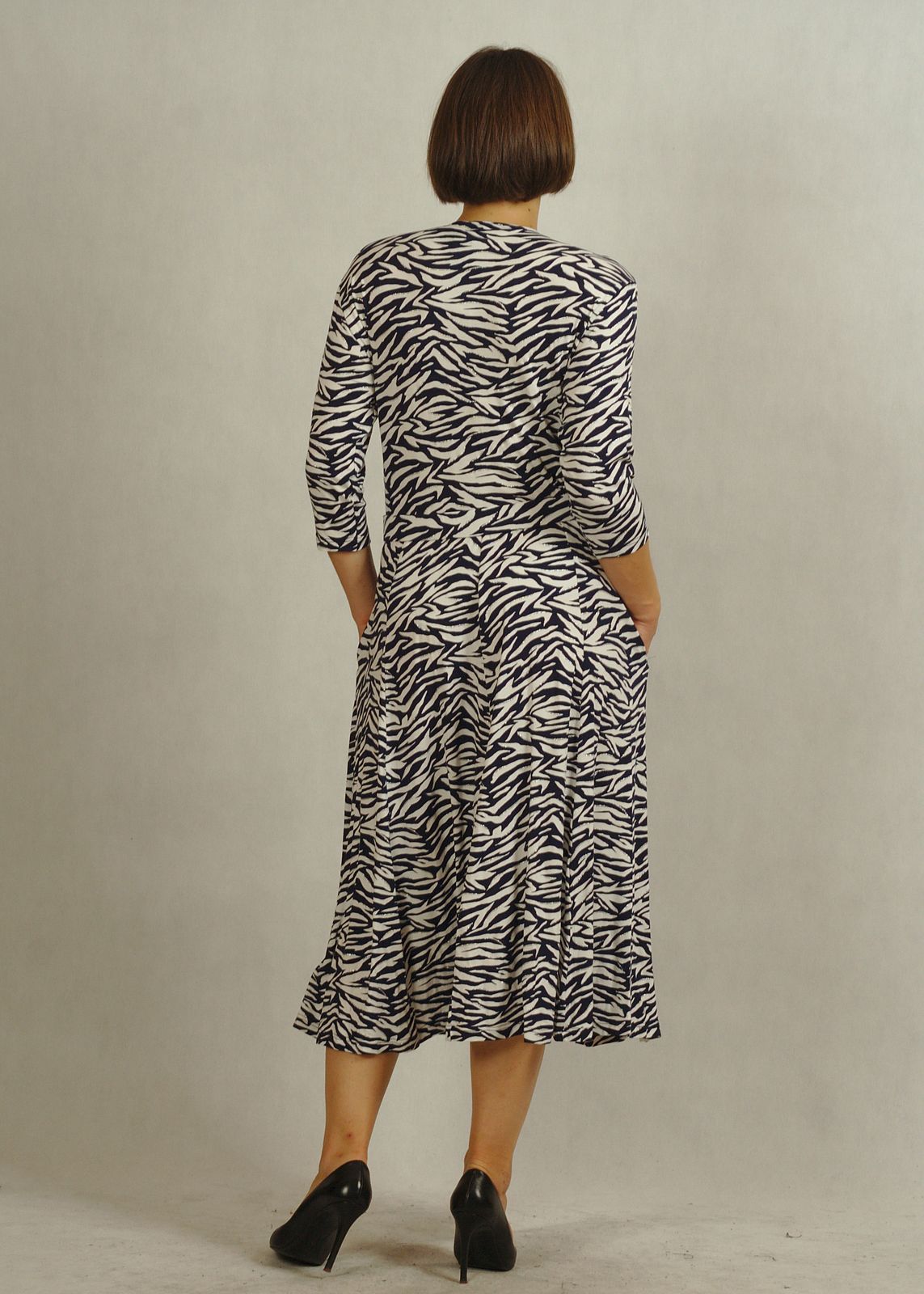 Sukienka midi z kopertowym dekoltem granatowo-biała zebra z połyskiem /757/