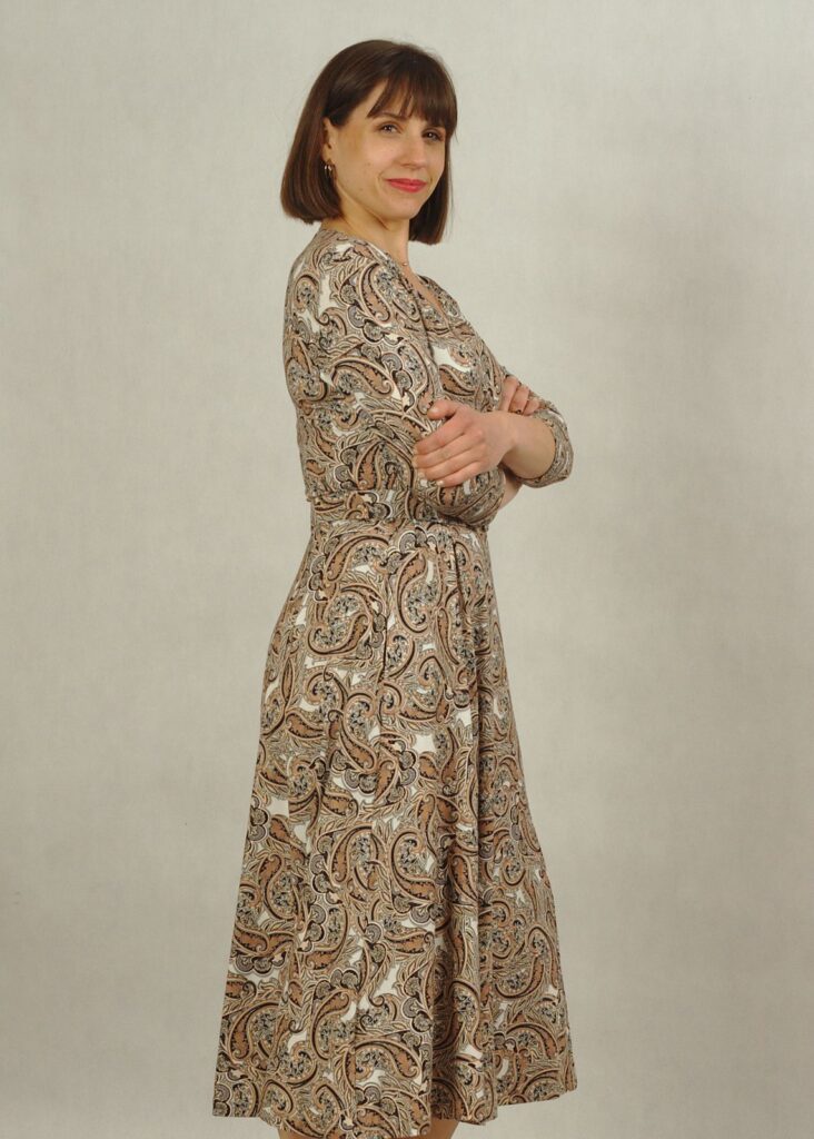 Uszyta z myślą o komforcie i elegancji, sukienka posiada praktyczne kieszenie, efektowny kopertowy dekolt oraz wygodne rękawy 3/4, które dodają klasy i subtelności.