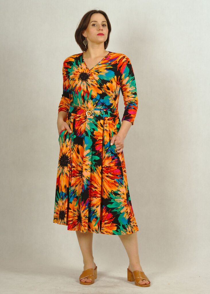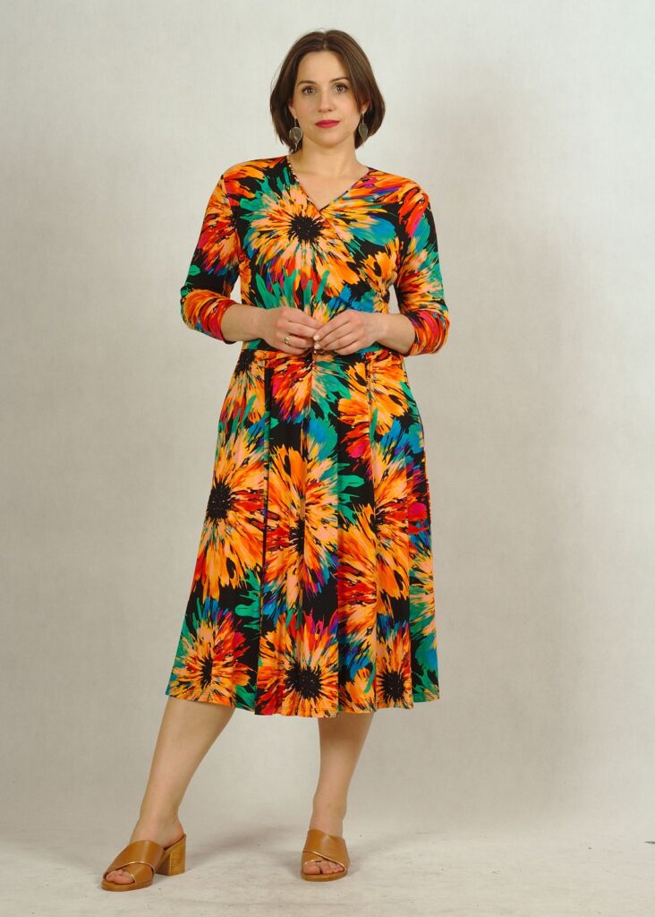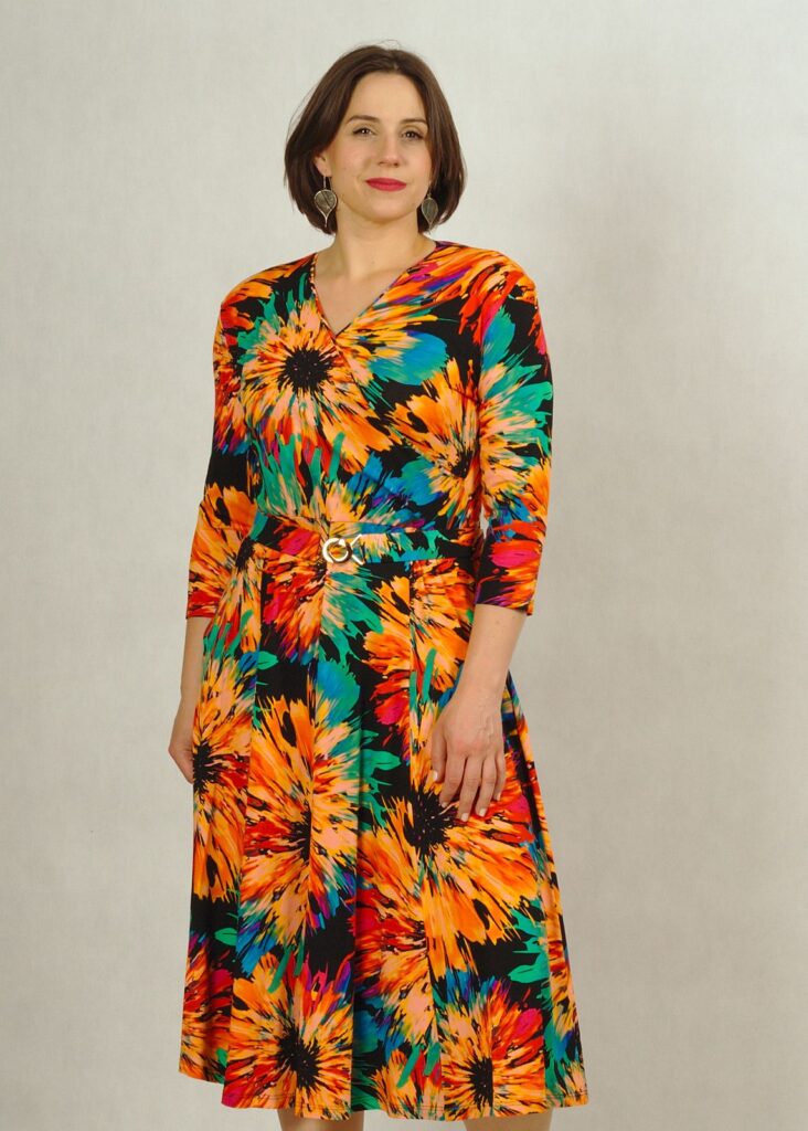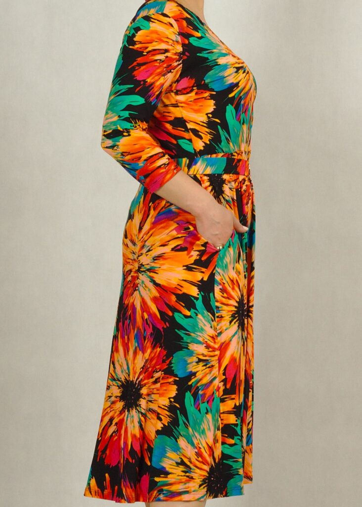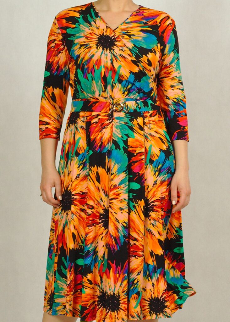 Sukienka jest wielokolorowa w duże pomarańczowe kwiaty słonecznika – wzór tuszuje absolutnie wszystkie niedoskonałości figury. Przeważający kolor to pomarańczowy*.