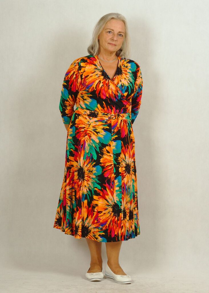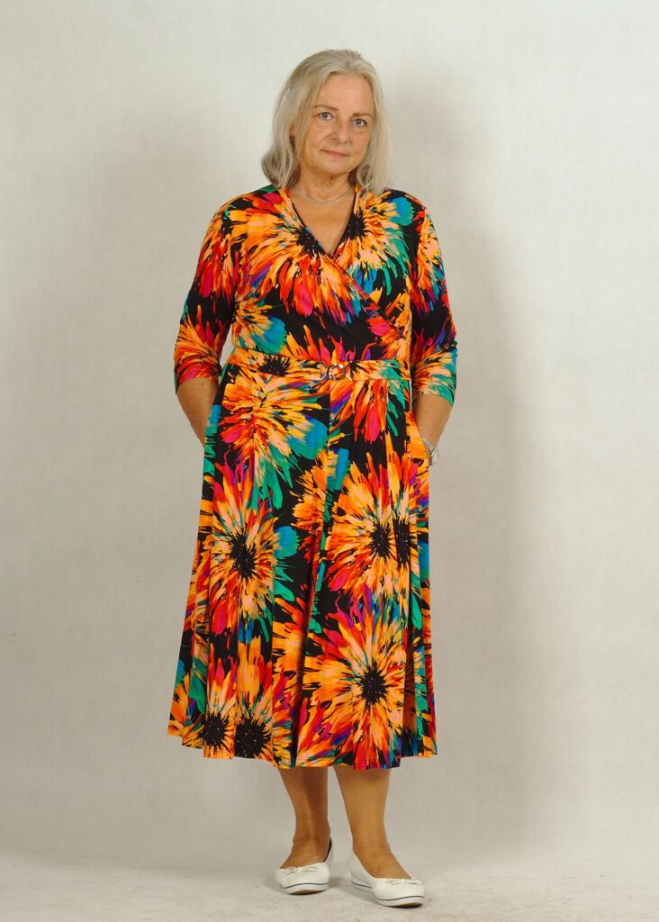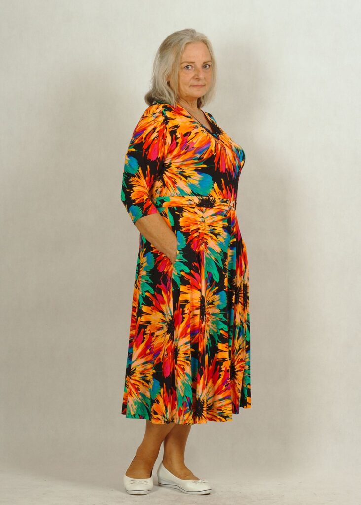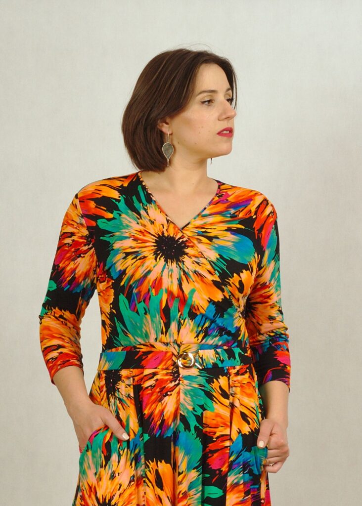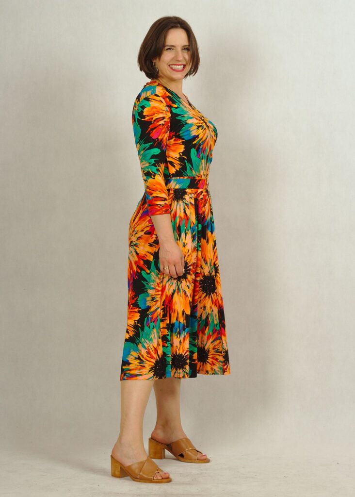 Sukienka jest wielokolorowa w duże pomarańczowe kwiaty słonecznika – wzór tuszuje absolutnie wszystkie niedoskonałości figury. Przeważający kolor to pomarańczowy*.
