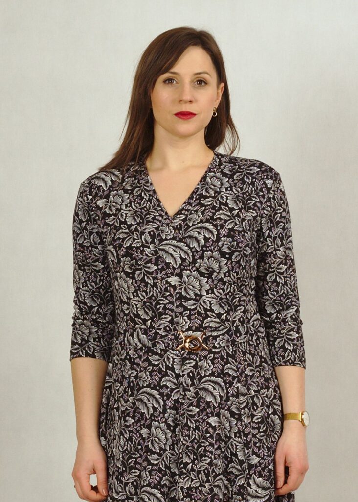 Przepięknie podkreśla biust oraz talię i jest szalenie elegancka, choć odszyta z dzianiny!