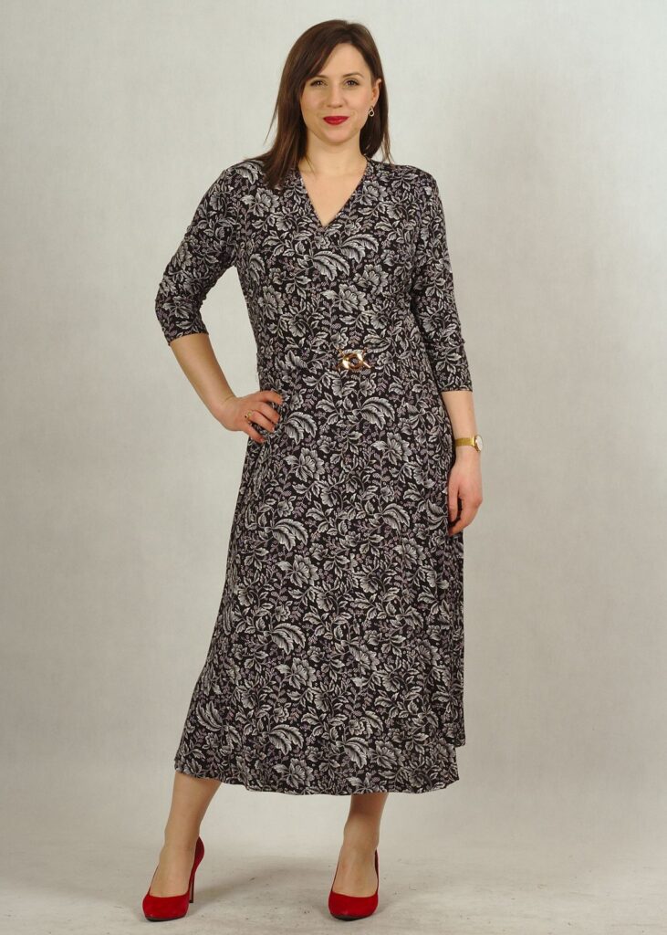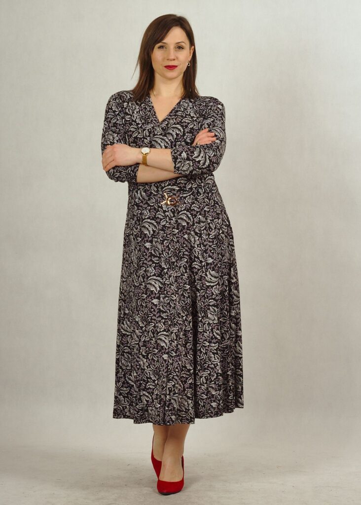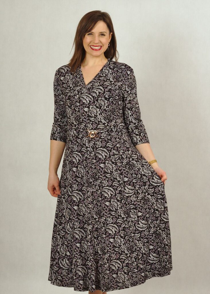 Sukienka ma kolor czarny* z białymi kwiatami i listkami, materiał jest śliczny i szykowny.