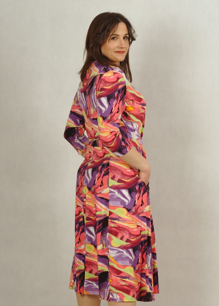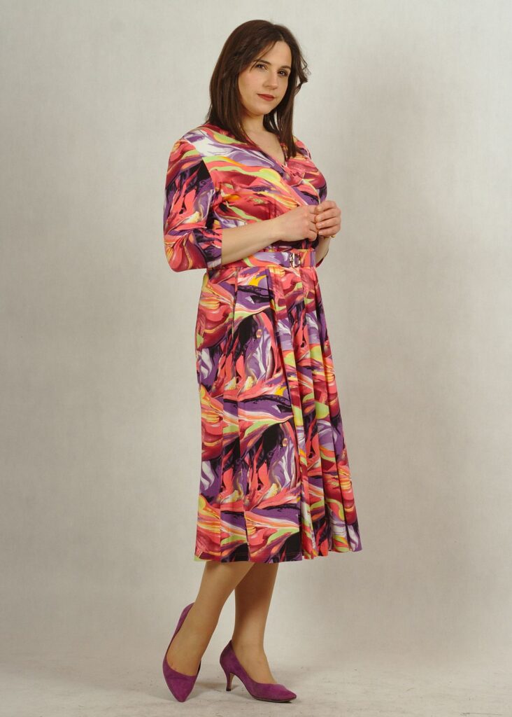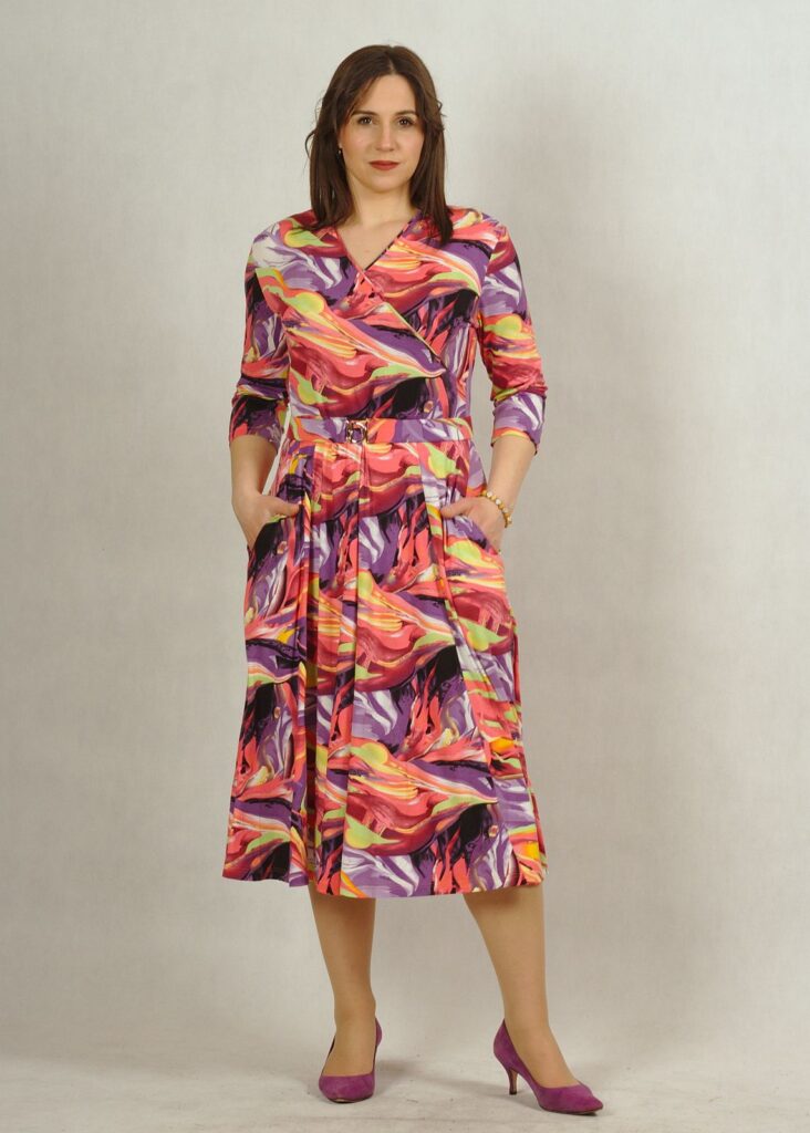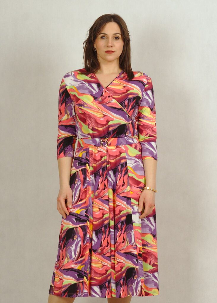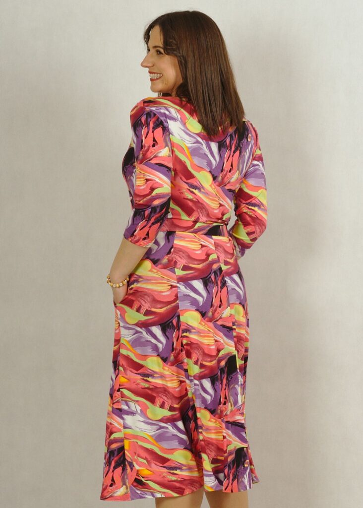 Sukienka jest wielokolorowa w piękne mazaje – wzór tuszuje absolutnie wszystkie niedoskonałości figury.