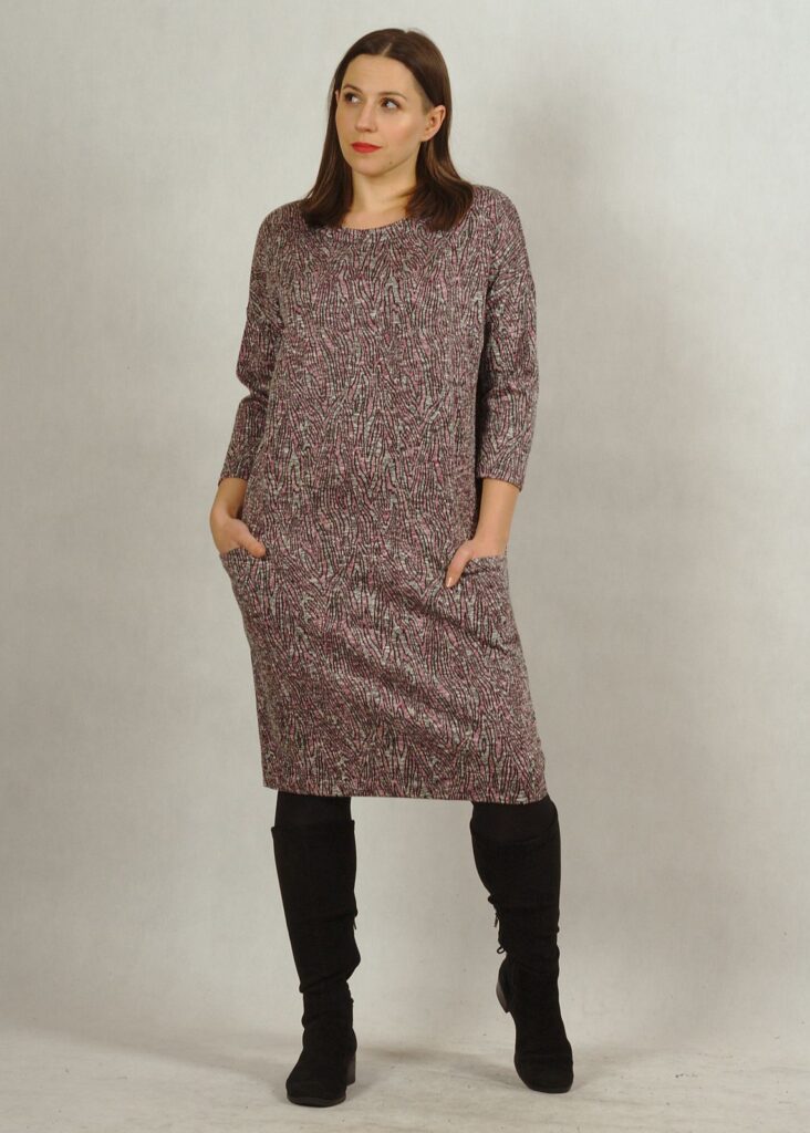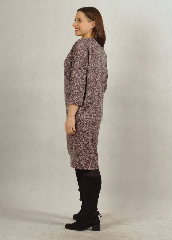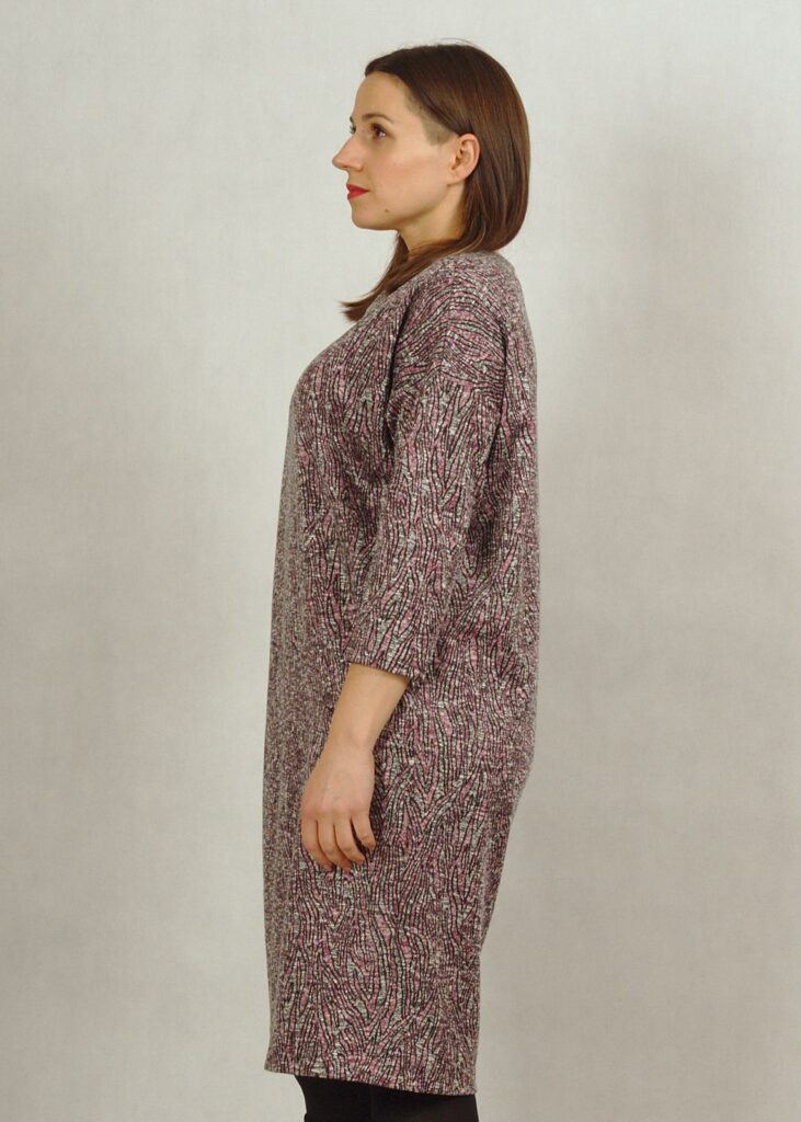Rękaw sukienki jest lekko opuszczony, tzw. kimono.