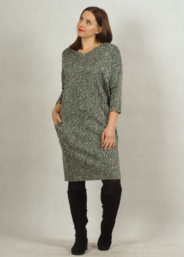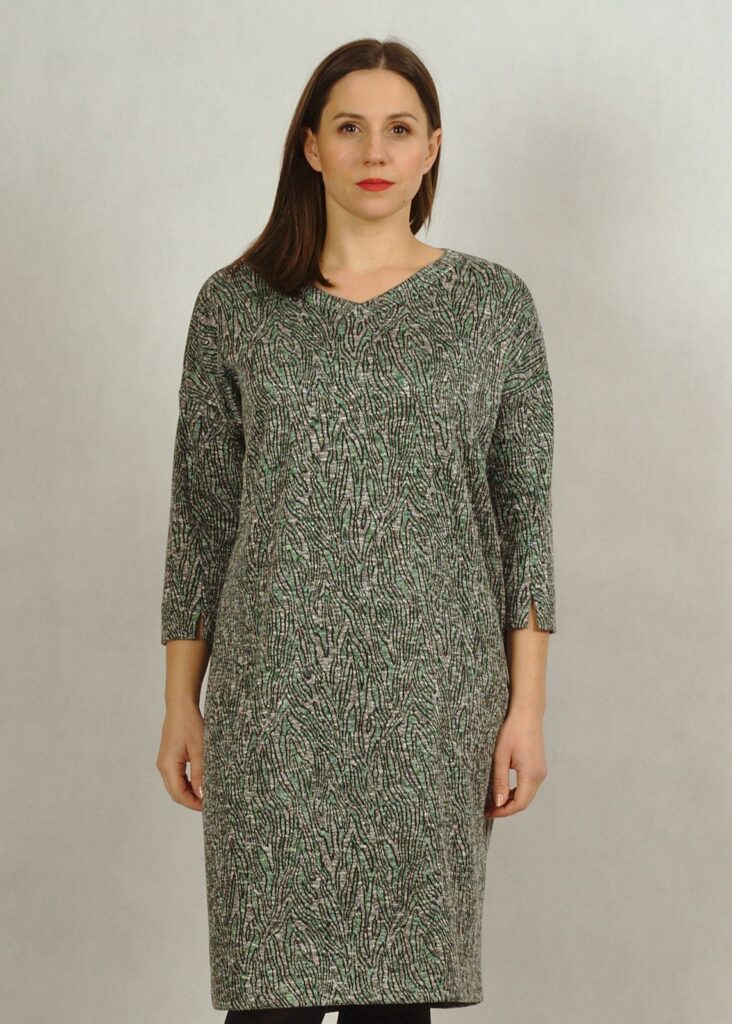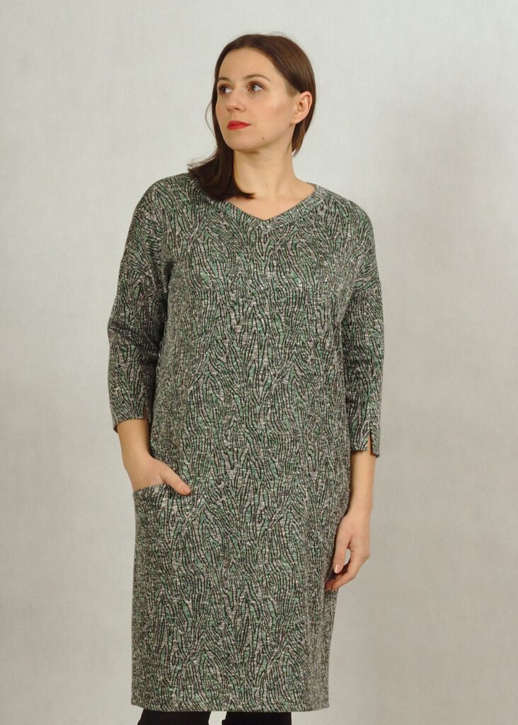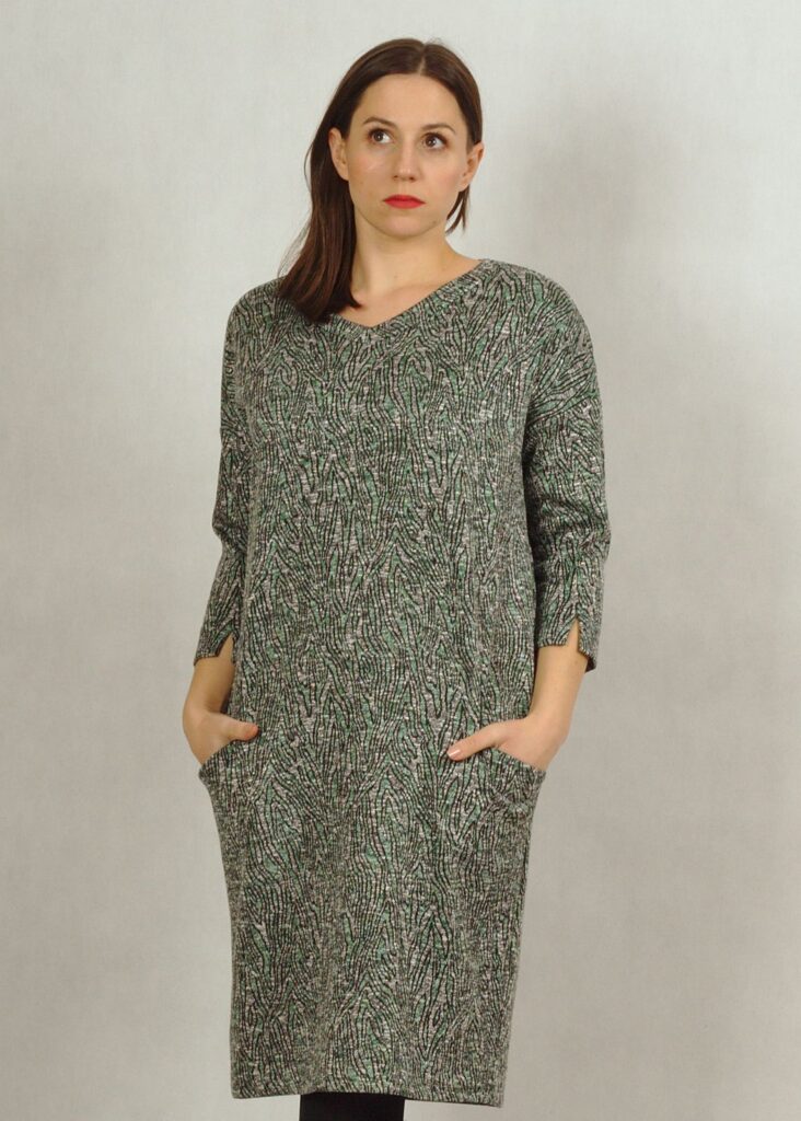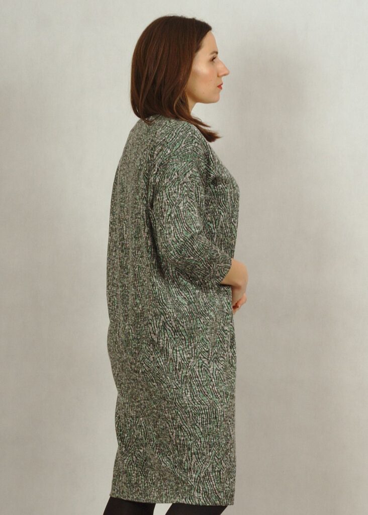 Rękaw sukienki jest lekko opuszczony, tzw. kimono.