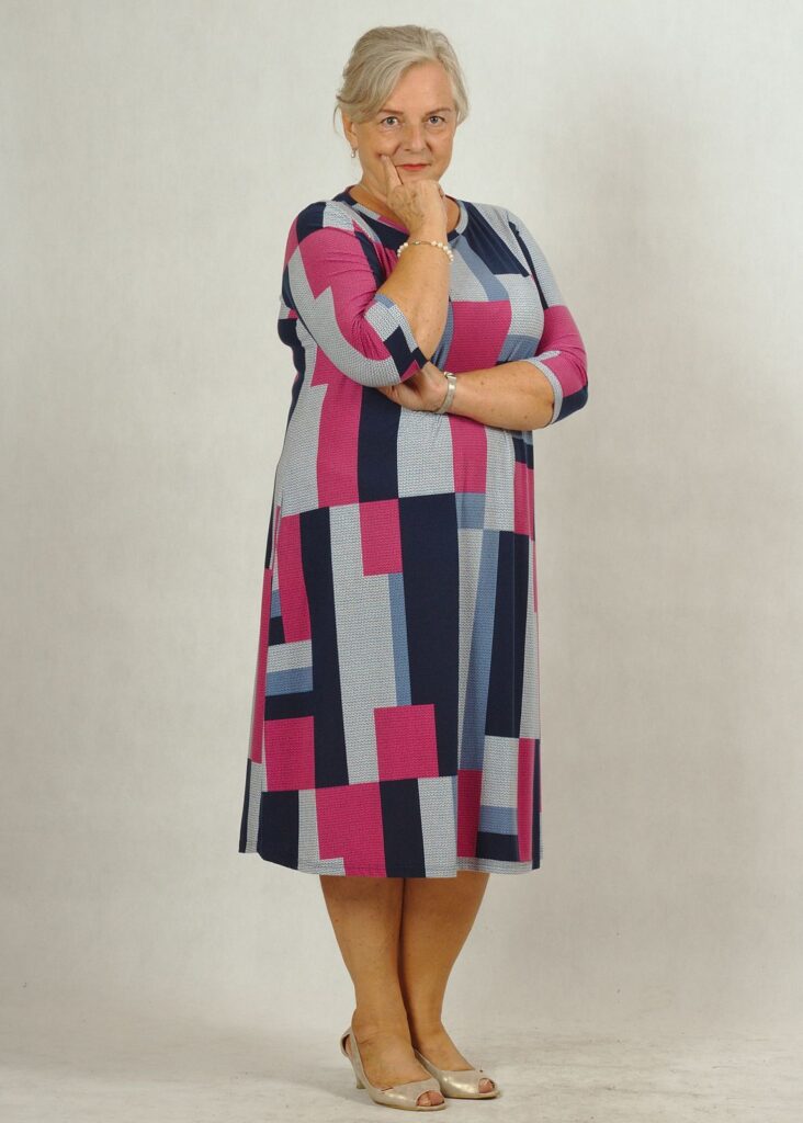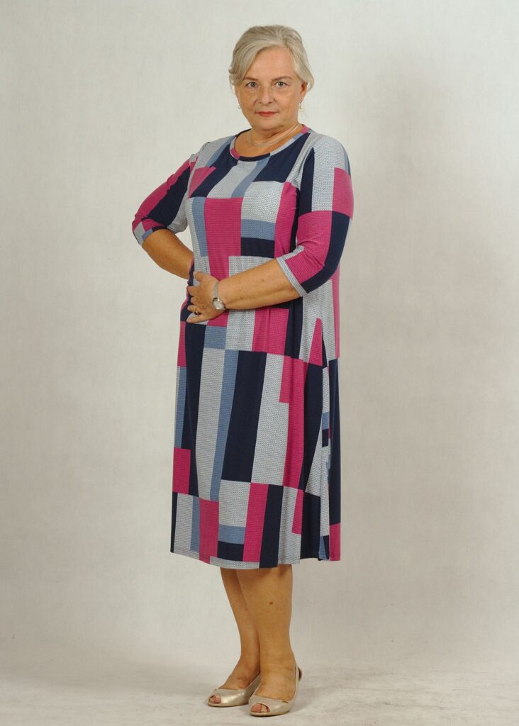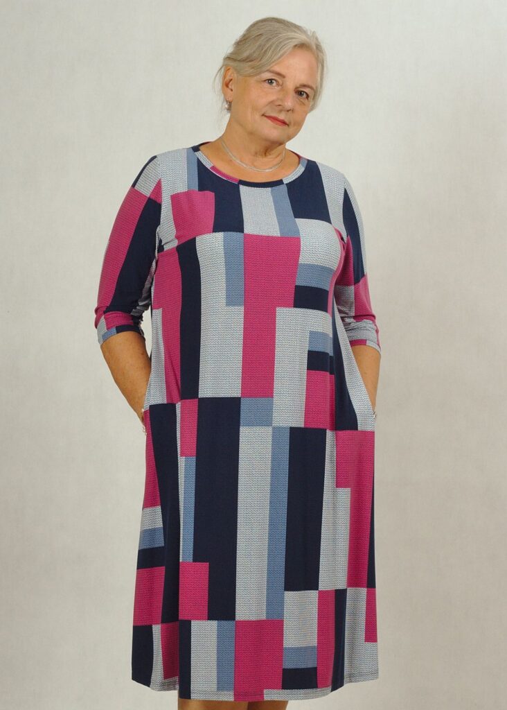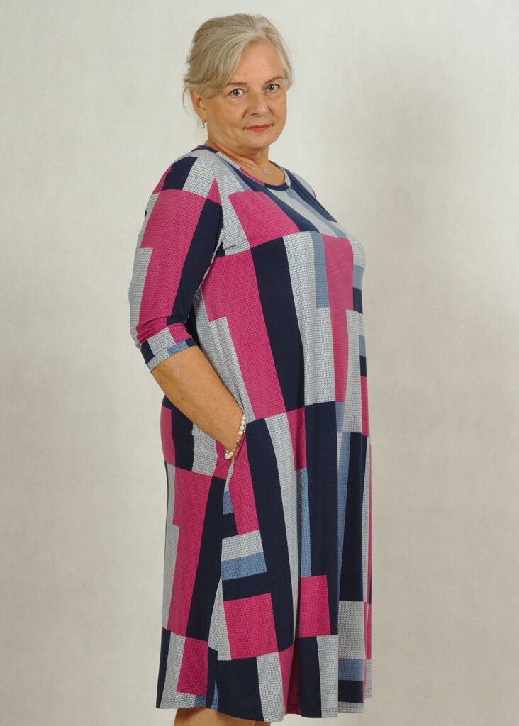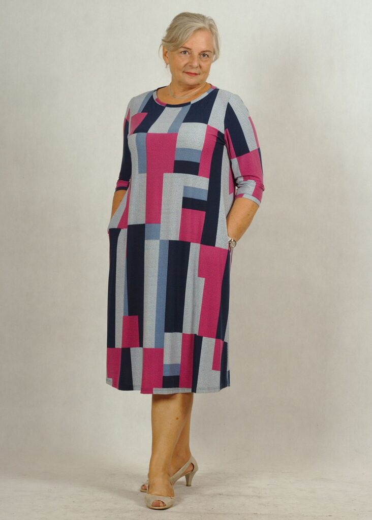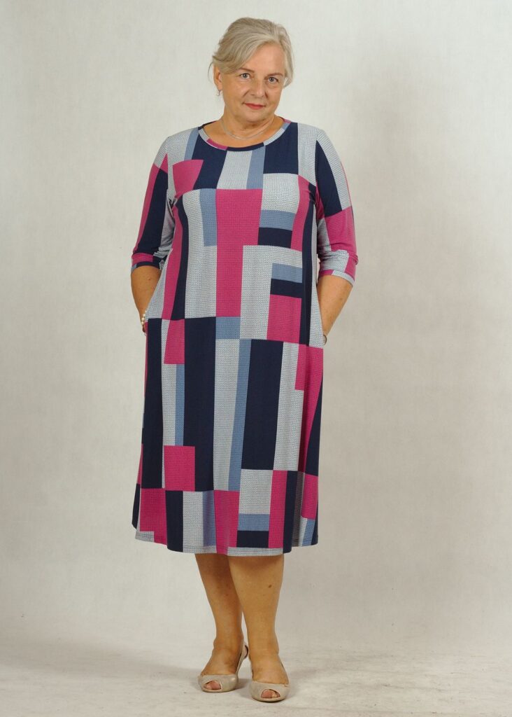 Sukienka ma ciekawy wzór w prostokąty i kwadraty.