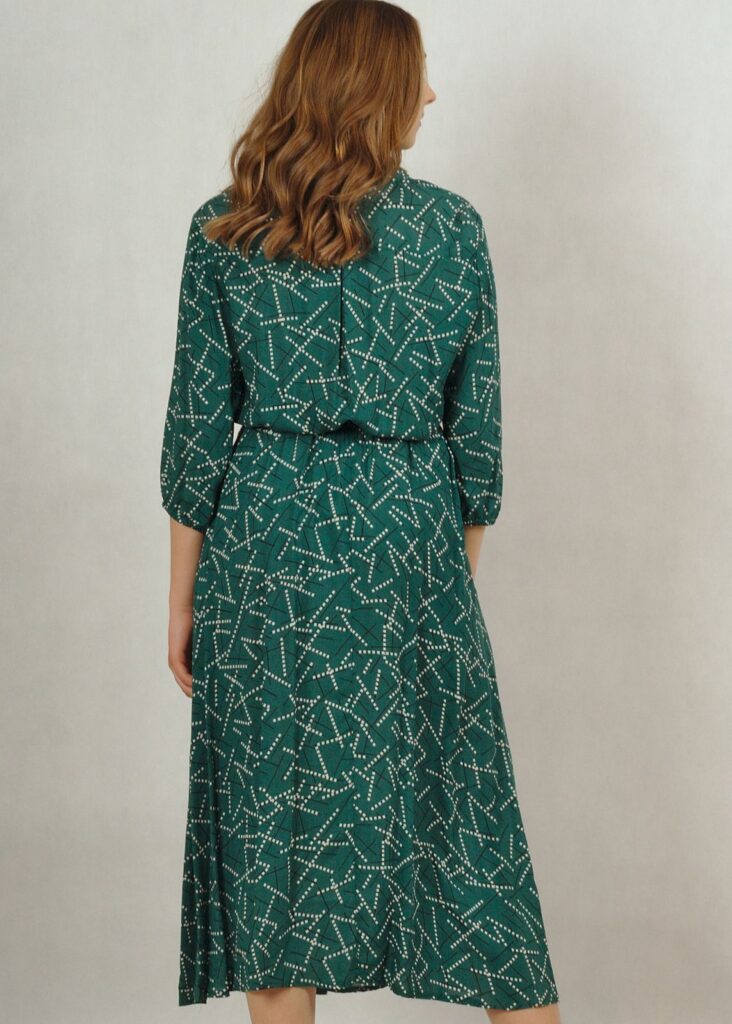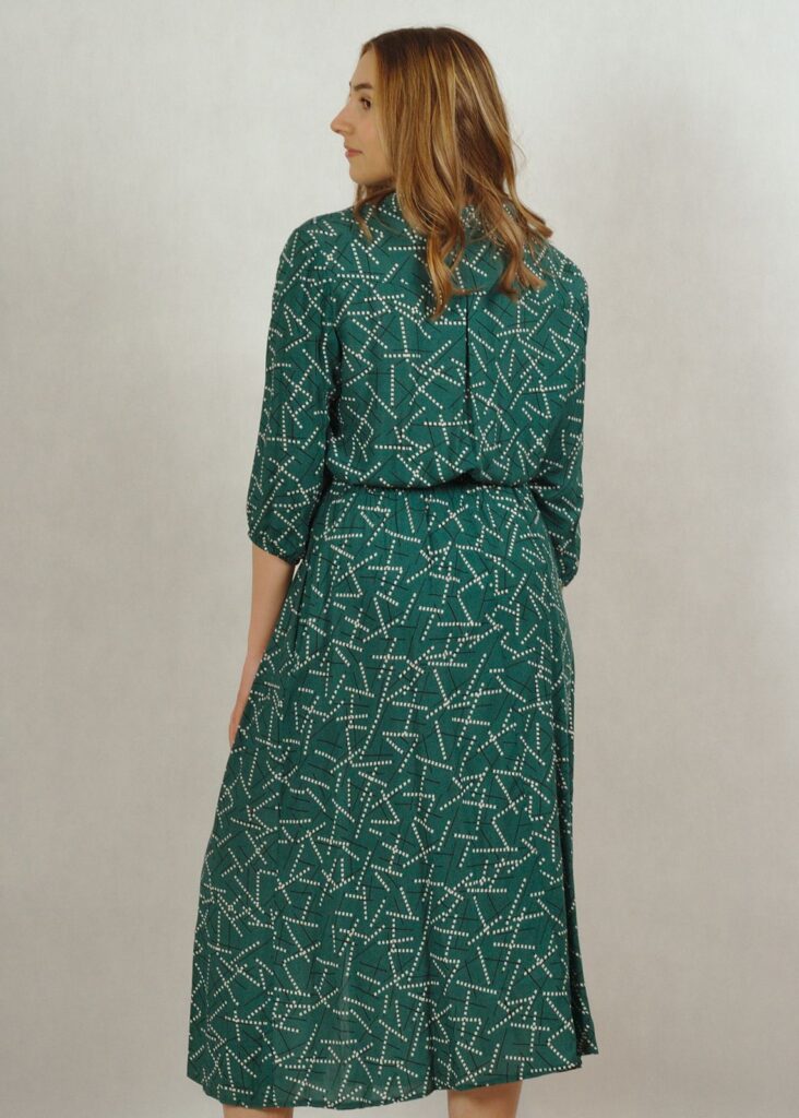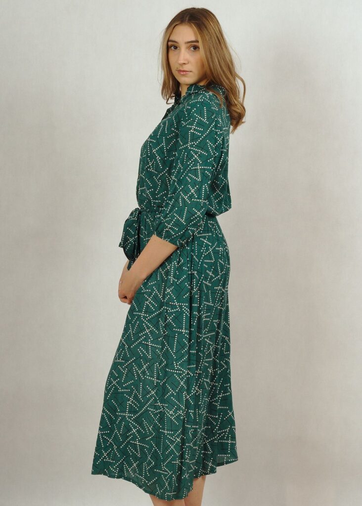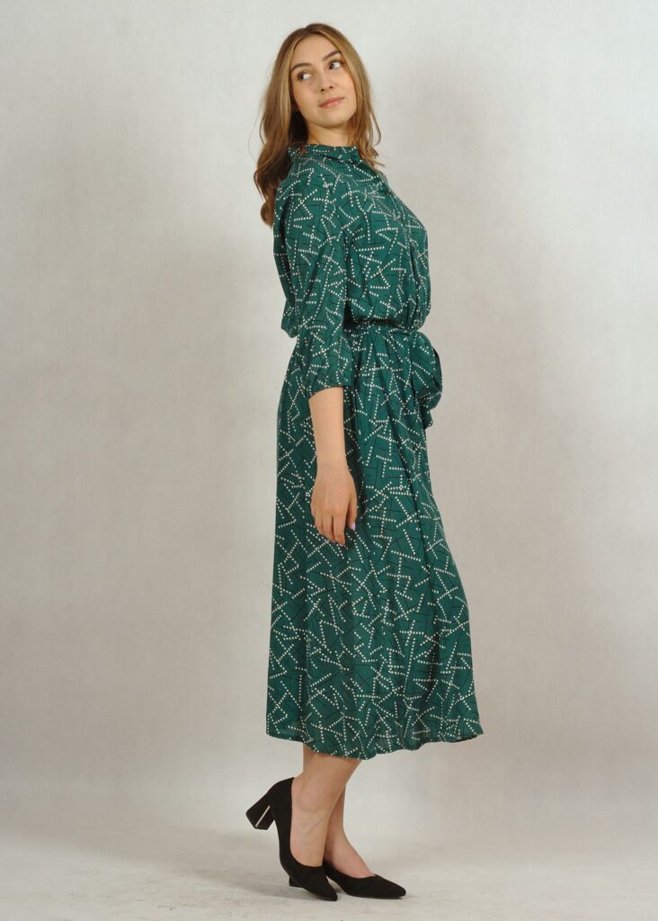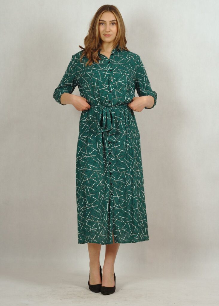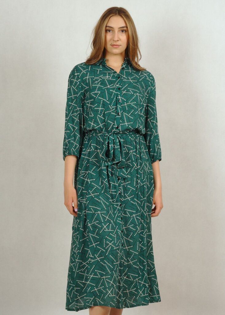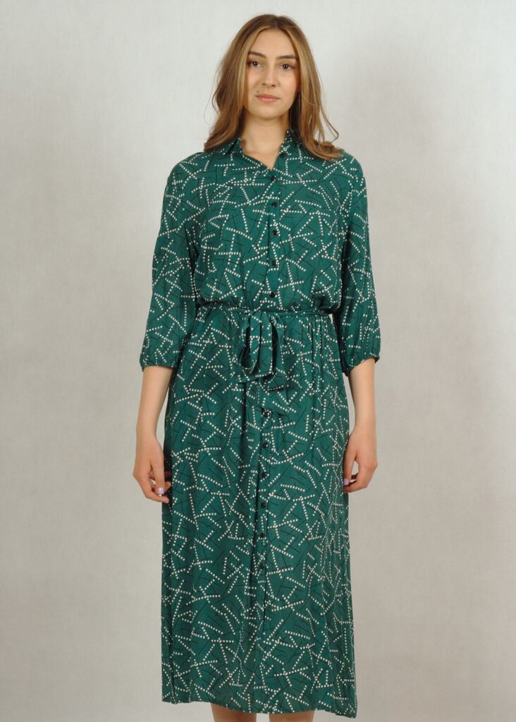 Dekolt wykończony kołnierzykiem, całość zapinana na drobne guziki.
