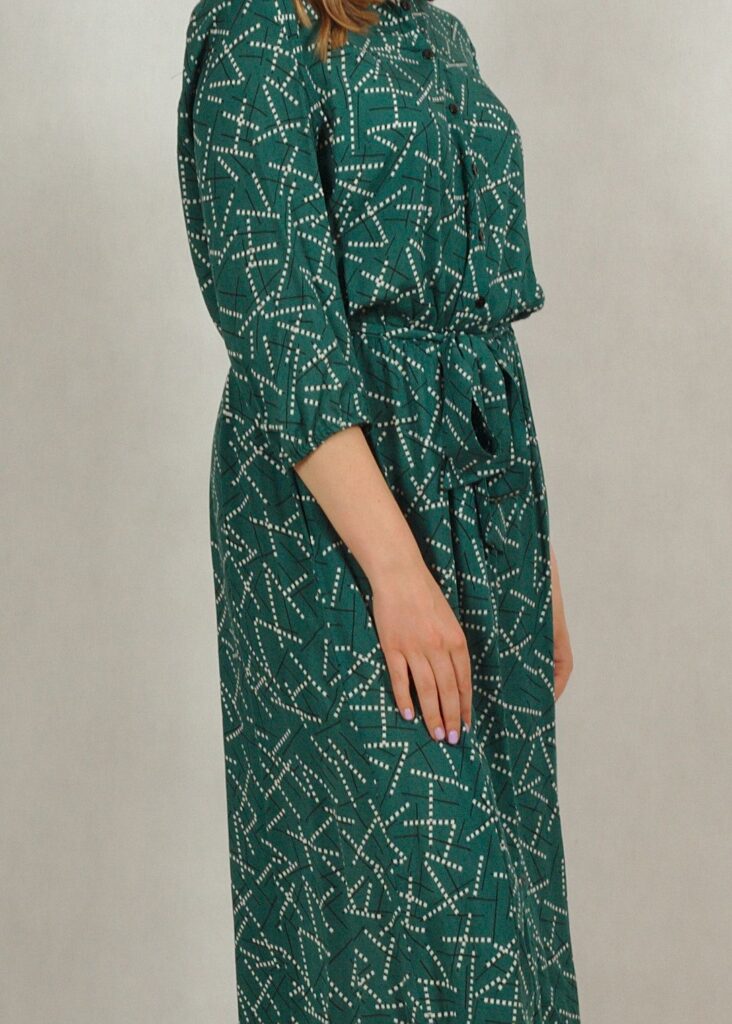 Sukienka posiada kieszenie oraz wiązanie w pasie, wykonane z tego samego materiału,co sukienka.