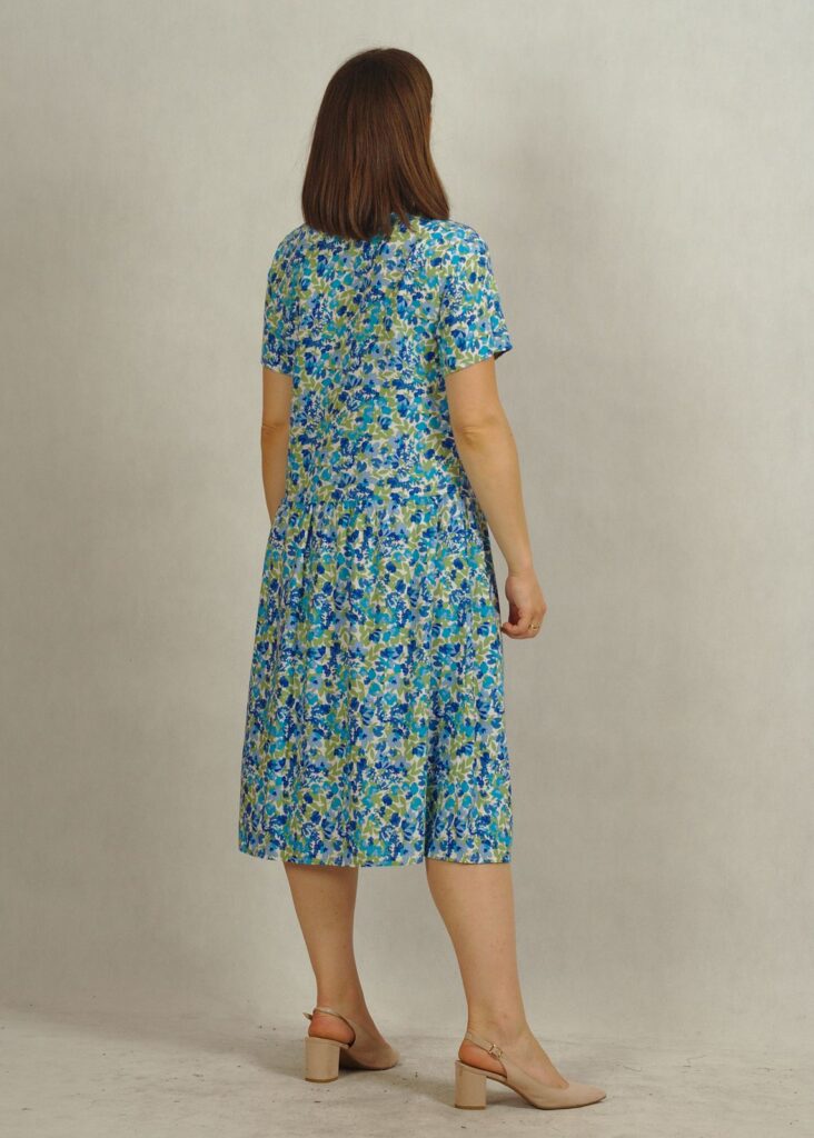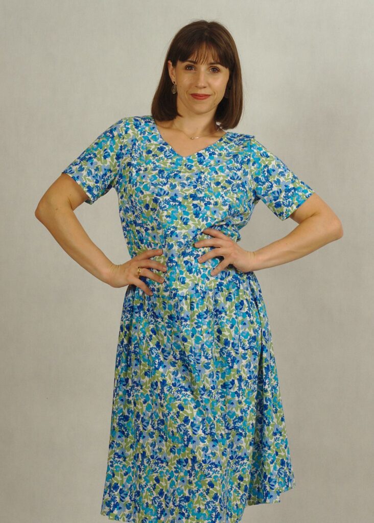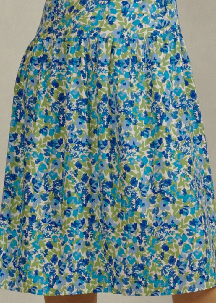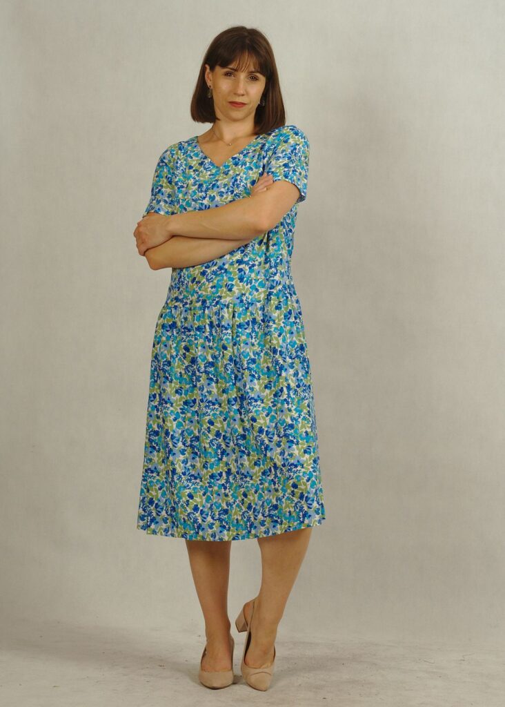Sukienka błękitna*w drobne kwiatuszki z pięknym dekoltem w serek, która podkreśla kobiecą sylwetkę doda Ci elegancji.