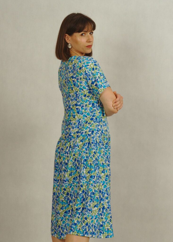 Sukienka z obniżonym stanem ma delikatne marszczenia przy biodrach, dzięki nim poczujesz się bardzo swobodnie!