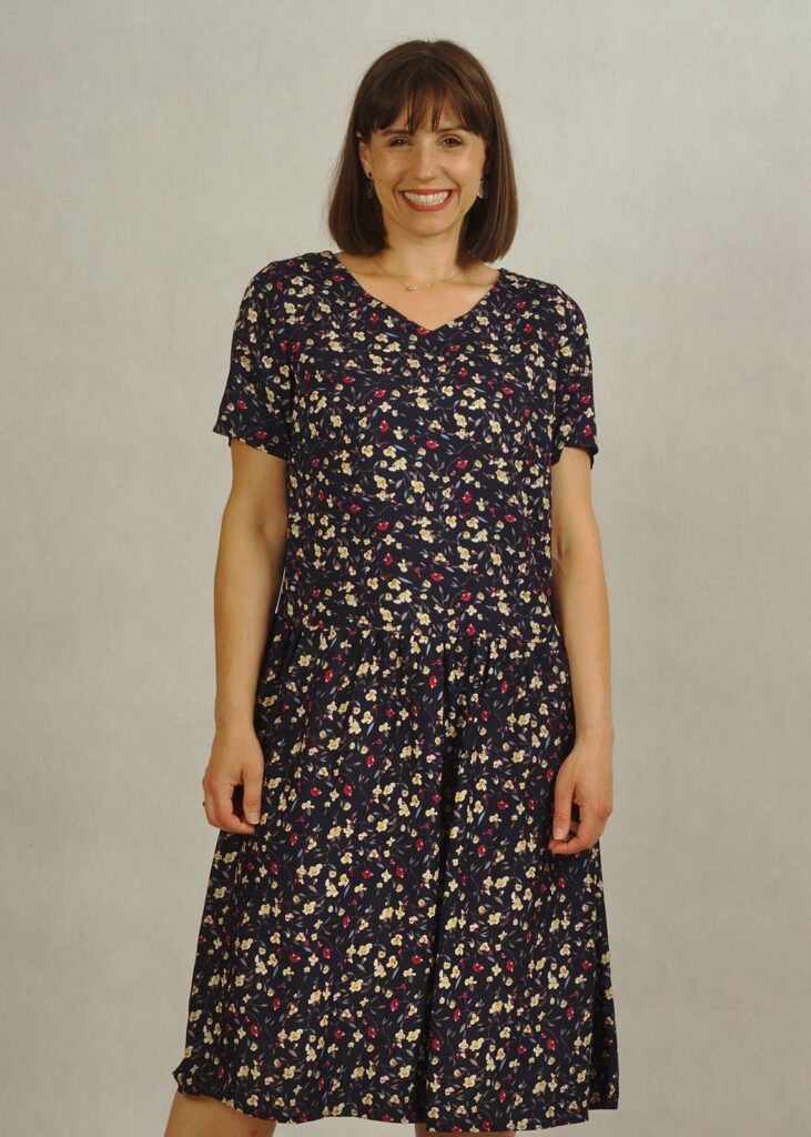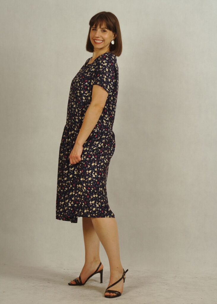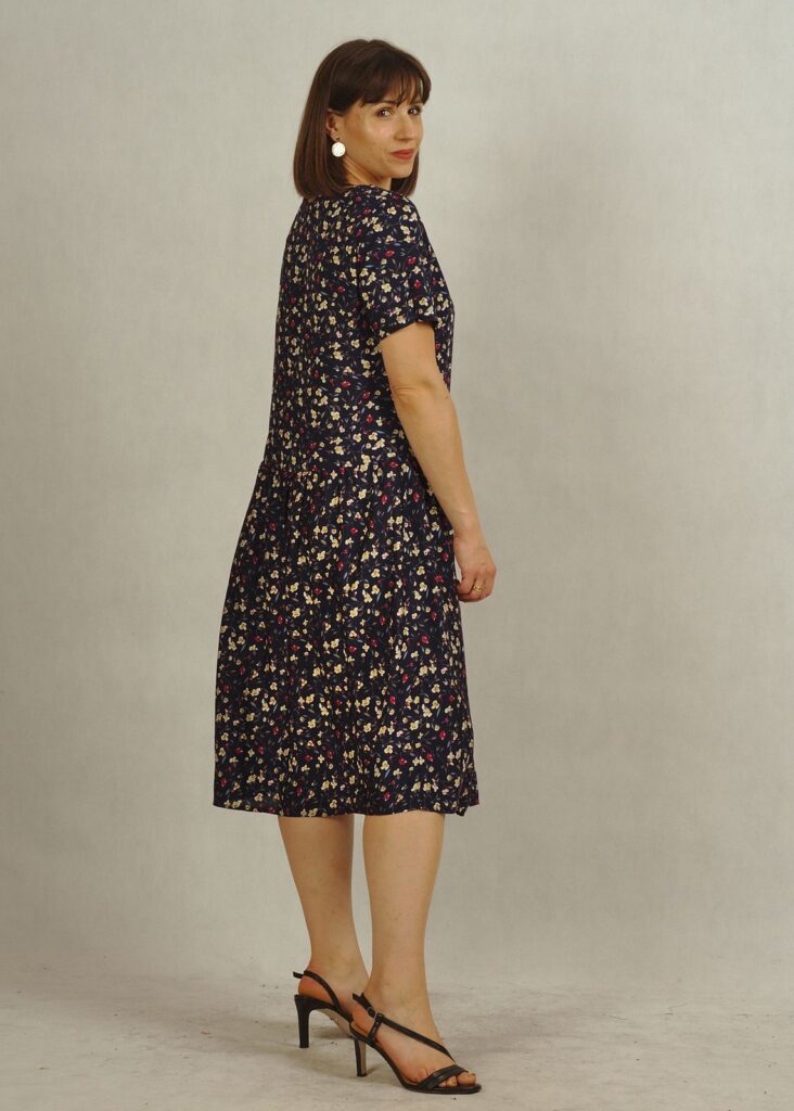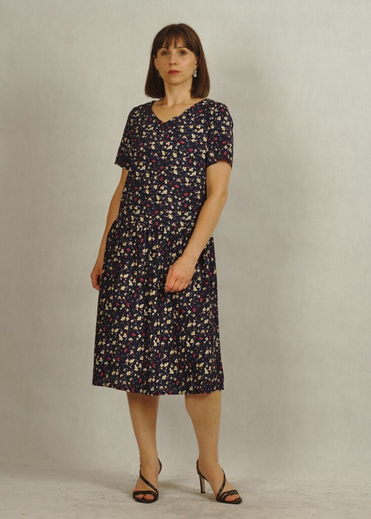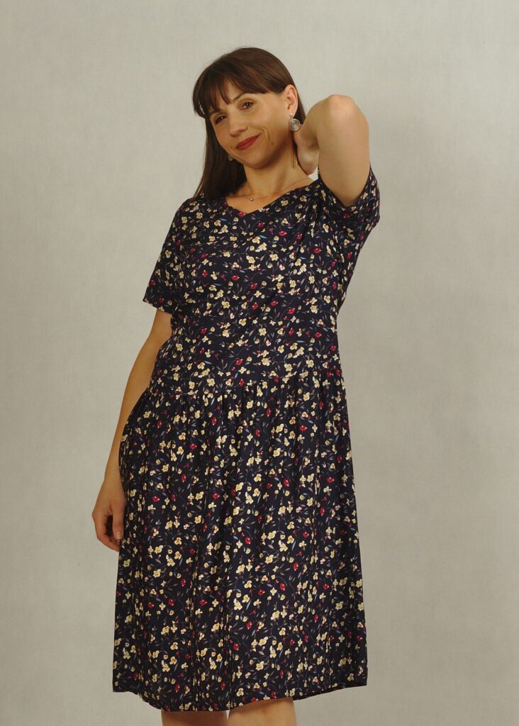Sukienka z obniżonym stanem ma delikatne marszczenia przy biodrach, dzięki nim poczujesz się bardzo swobodnie!