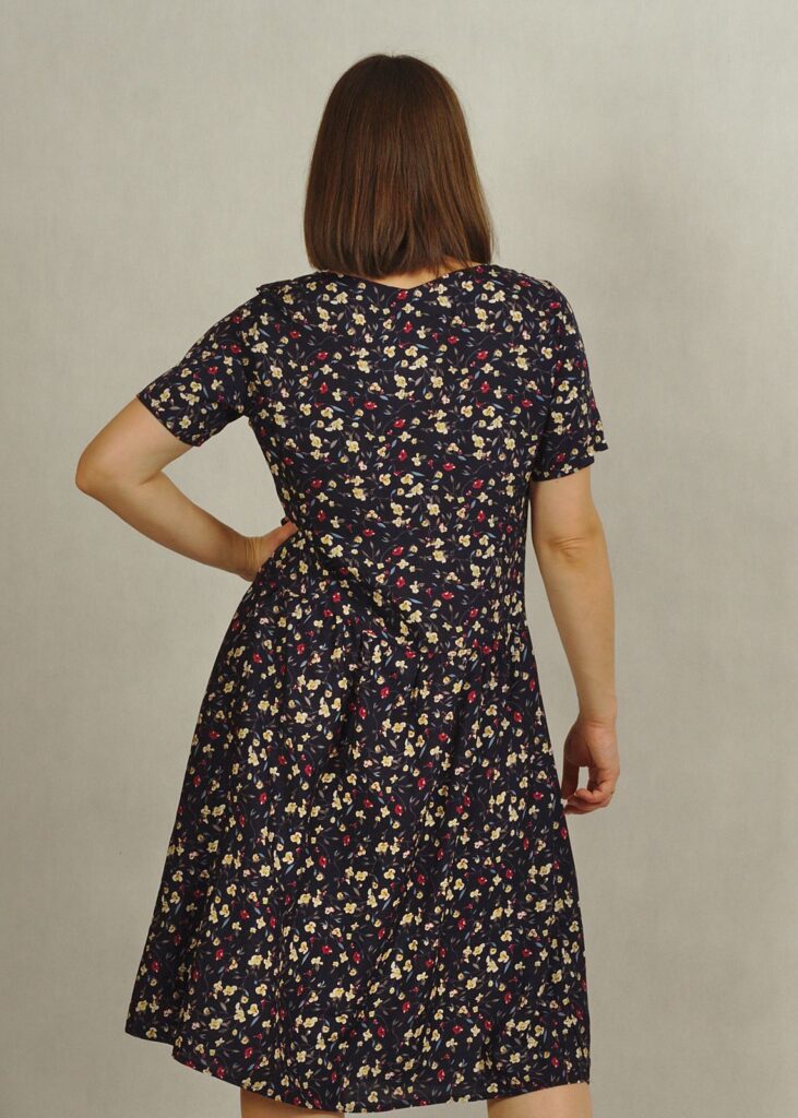Oferujemy sukienkę na krótki rękaw, która świetnie sprawdzi się podczas ciepłych dni, zapewniając komfort i styl.